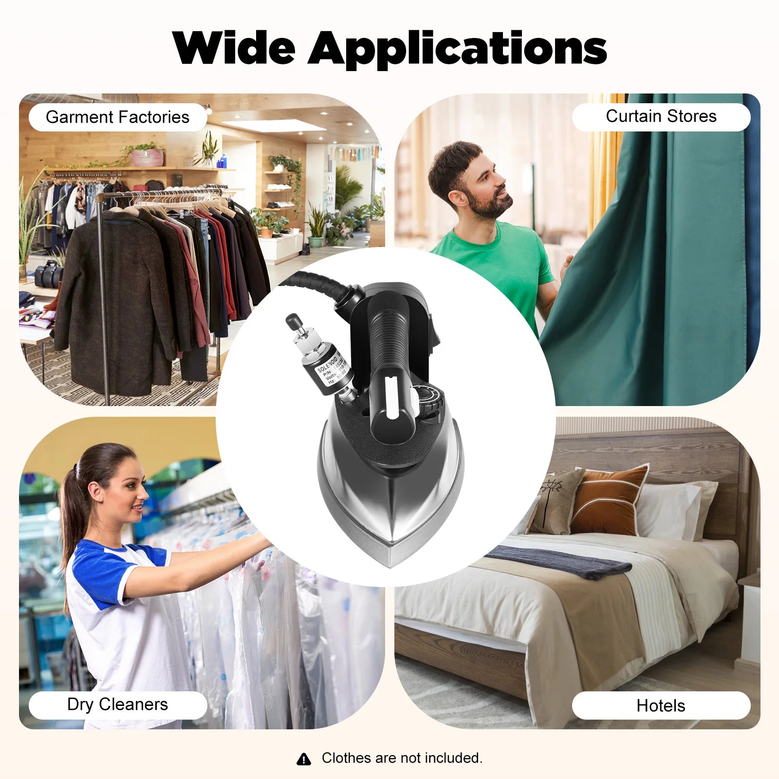 It can be used for dry ironing or ironing with steam in garment factories, curtain stores, clothing stores, dry cleaners, hotels, etc.
