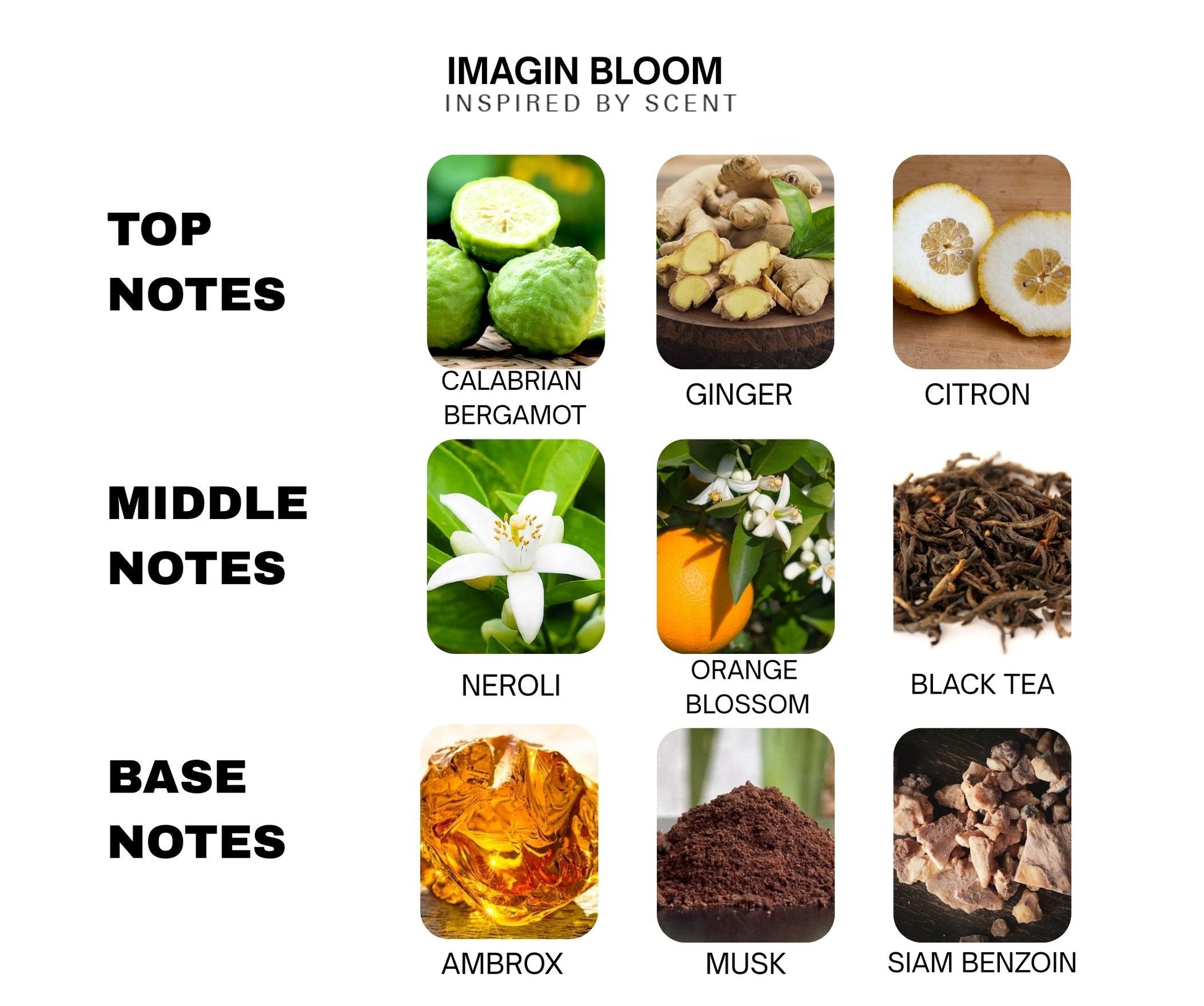Imagin Bloom is a scent of clarity and elevation. Inspired by Louis Vuitton Imagination, it opens with vibrant Calabrian bergamot and sparkling ginger, creating a zesty lift. The heart adds a floral-citrus touch with neroli, grounded by the refined depth of black tea. The base is clean and subtly sensual — ambrox, musk, and warm Siam benzoin wrap the scent in an effortless finish.
