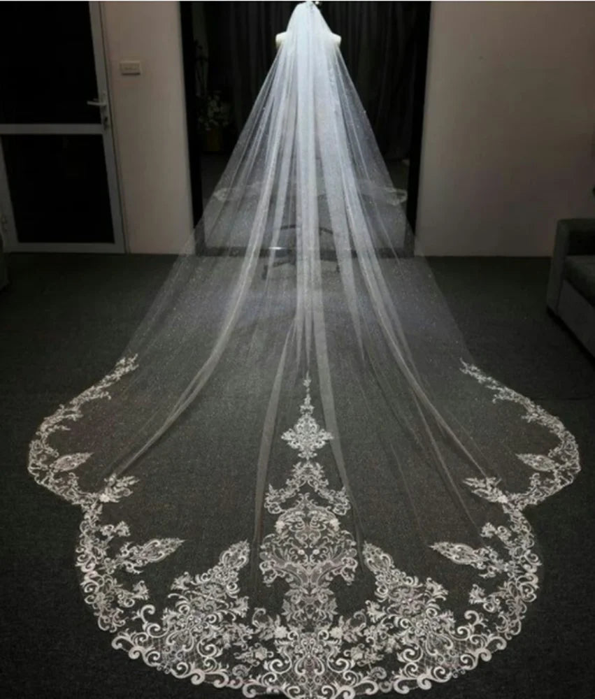 3M Long Cathedral Length White Ivory Bridal Veils with Appliques