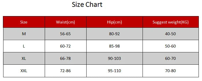 XL: Waist 66-78cm; Hip 90-103cm; Suggest Weight 60-70kg