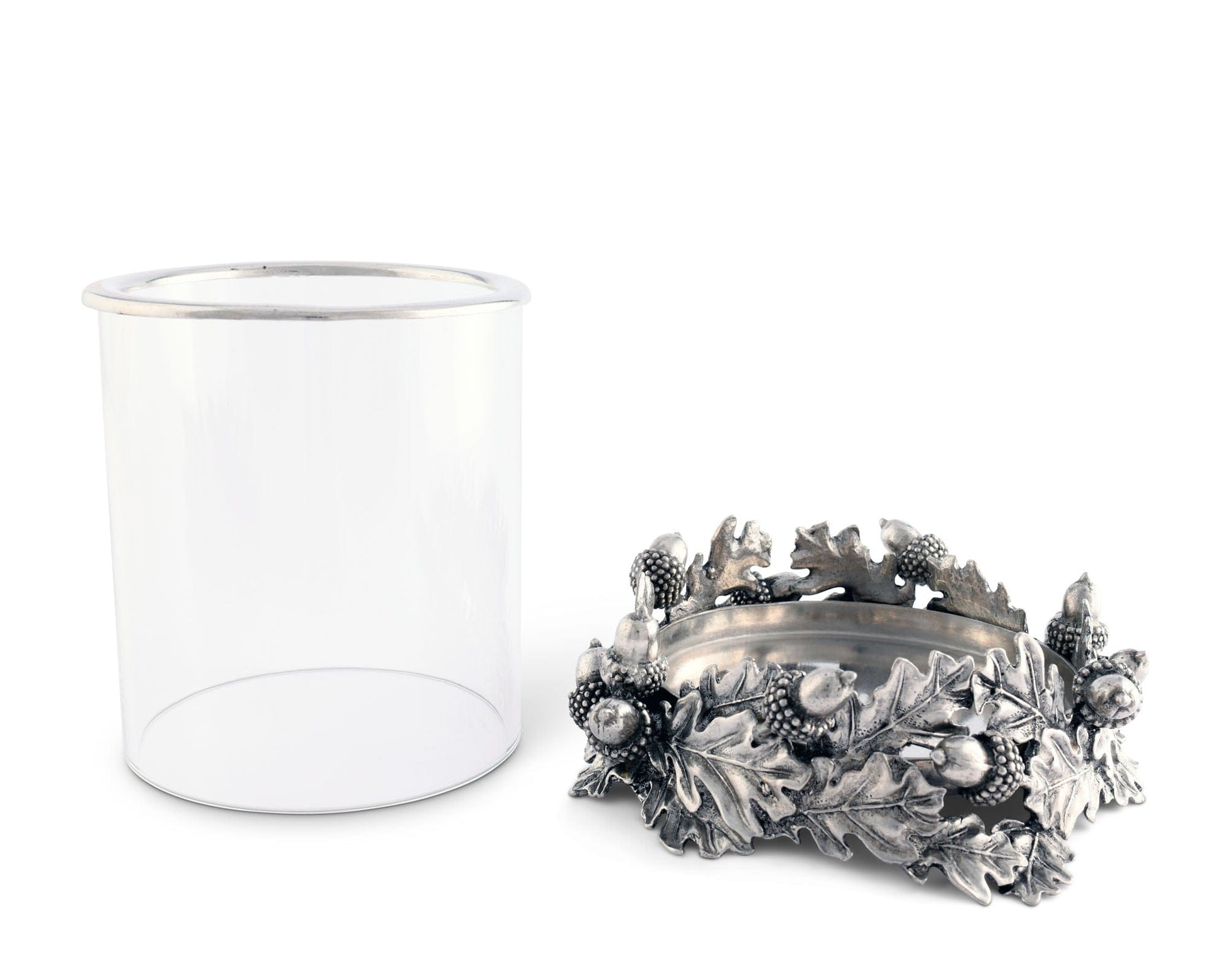 Embrace the tranquility of a magical forest with Vagabond House's Majestic Forest Collection Acorn Oak & Leaf Hurricane. Crafted in high-end pewter and glass, this candle holder illuminates your room with a gentle glow. The base, a wreath of exquisitely detailed acorns and oak leaves, accentuates the beauty of its satin-finished pewter rimmed removable glass. Its generously sized 4" W x 6" T design is perfect to softly light your special occasions while amplifying the elegance with its nature-inspired design.