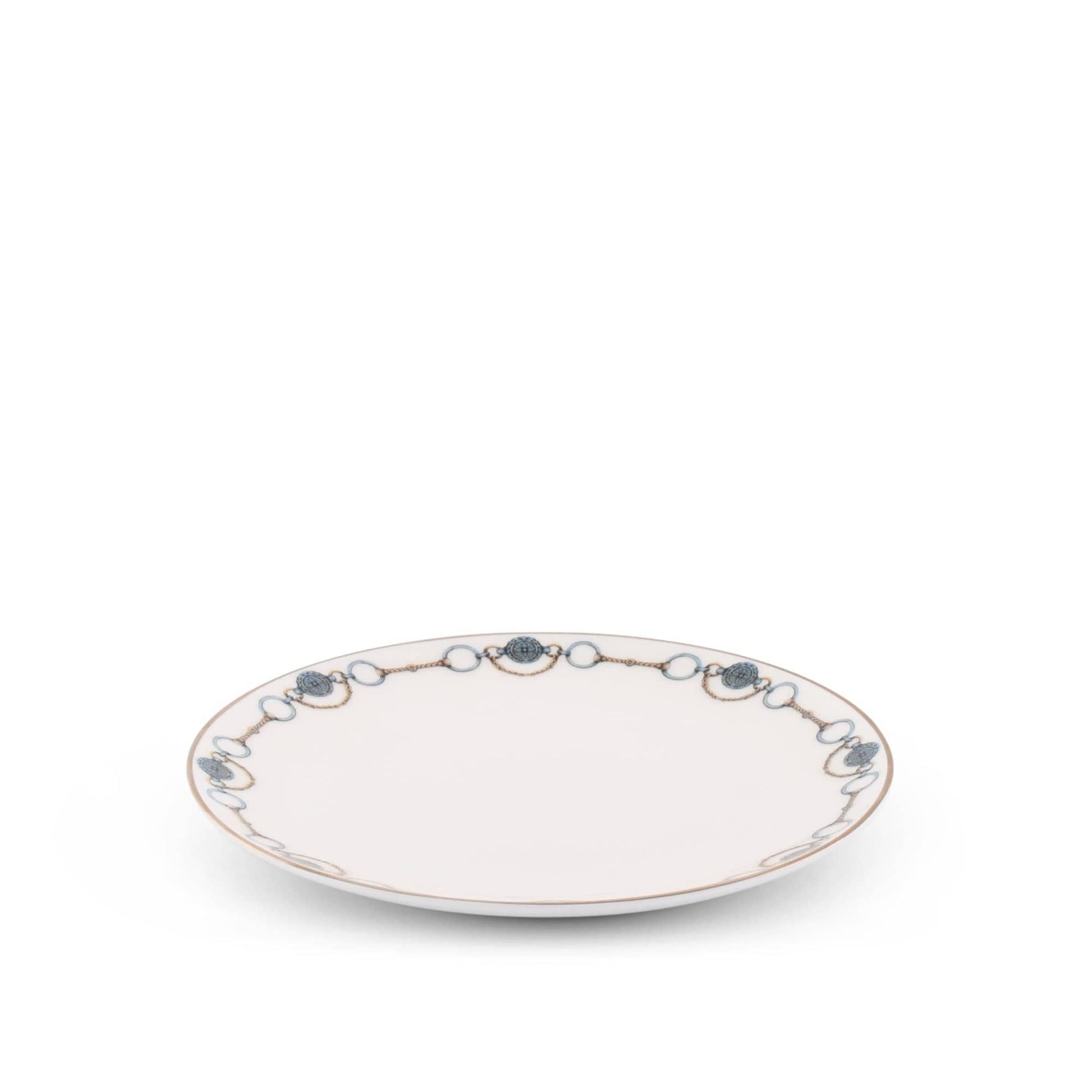 The Amarillo Concho Pattern Bone China Round Bread Plate is a fusion of bold western aesthetics and premium Bone China. This luxury bread plate is versatile, designed and painted by the celebrated artist Leesa Greenlee. An intricate silver Concho pattern pendant on pewter O ring snaffle bits dancing across the surface, completed by a subtle gold rim gives it an edge over other dinnerware. The generous 6.5 Diameter size is perfect for serving a range of exquisite delicacies, adding elegance to your special dinner events.