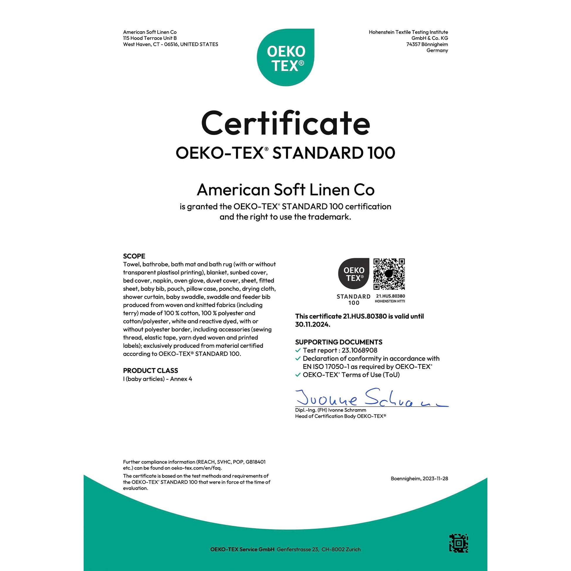 OEKO-TEX® STANDARD 100 keeps you and your family safe by testing [each component of] a certified product against a list of over 1,000 harmful substances. Certificate #21.HUS.80380 by Hohenstein.