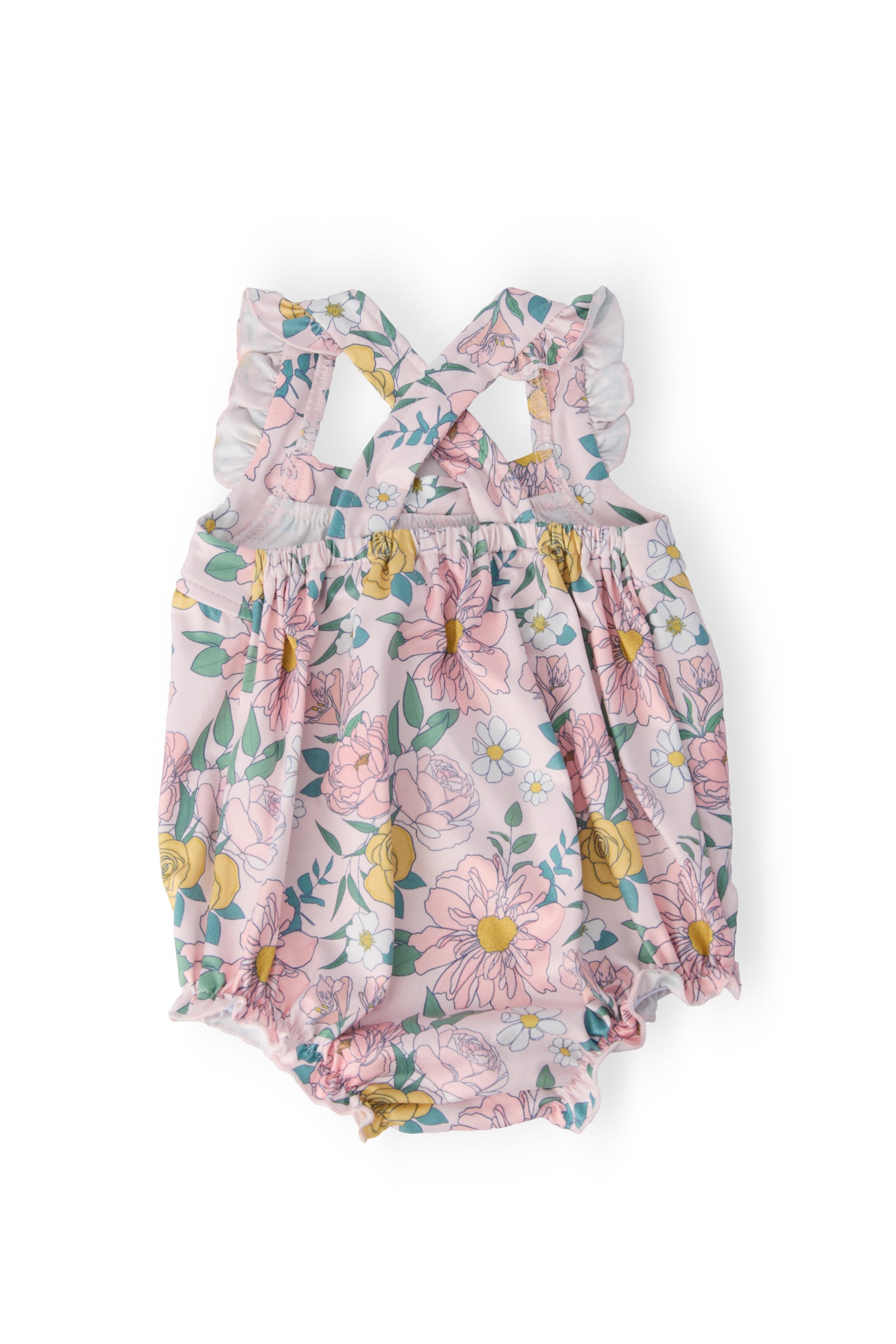 Our Ruffle Cross Back Romper is perfect for summer! Straps criss cross in the back with a sweet ruffle on the shoulder. Snaps for easy diaper changes.
