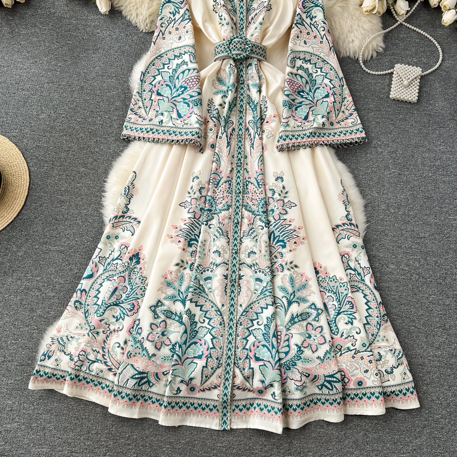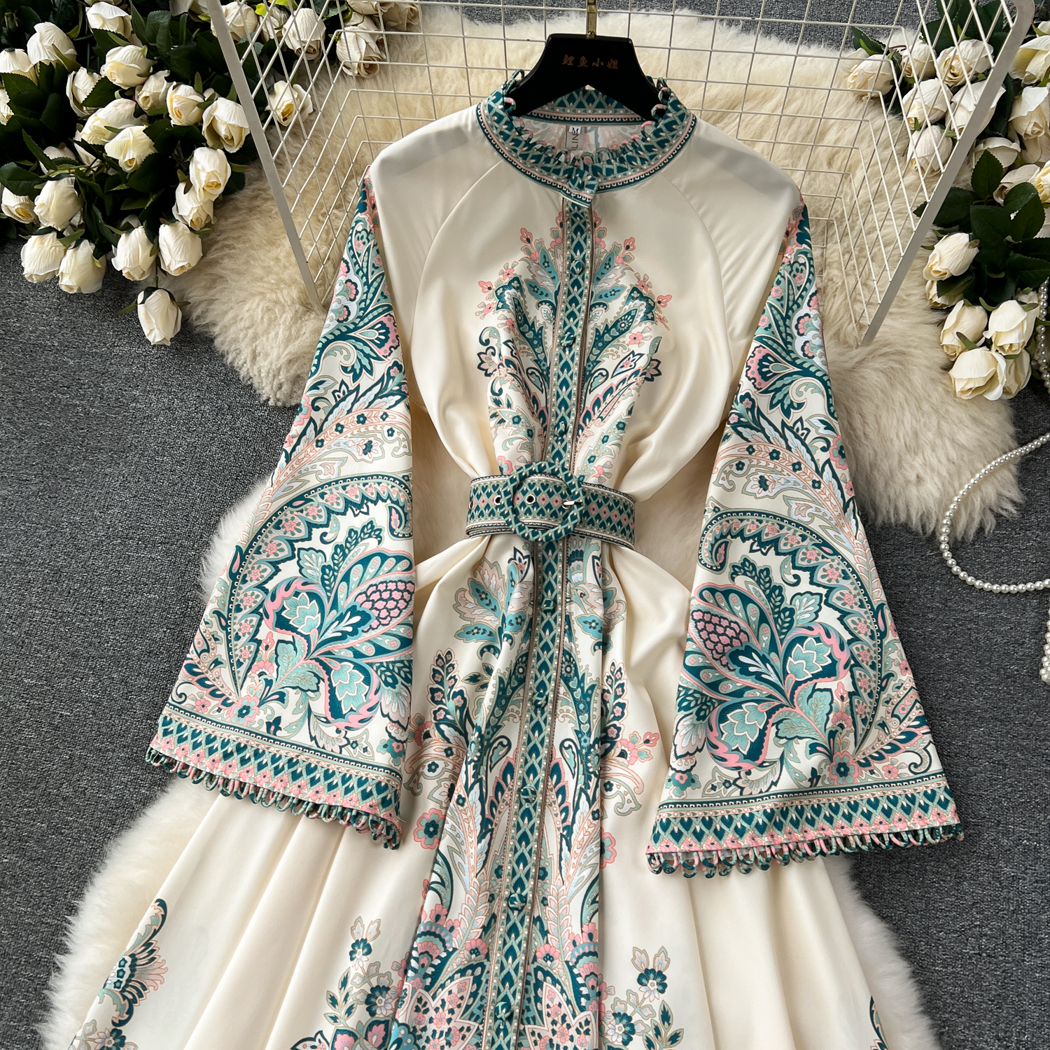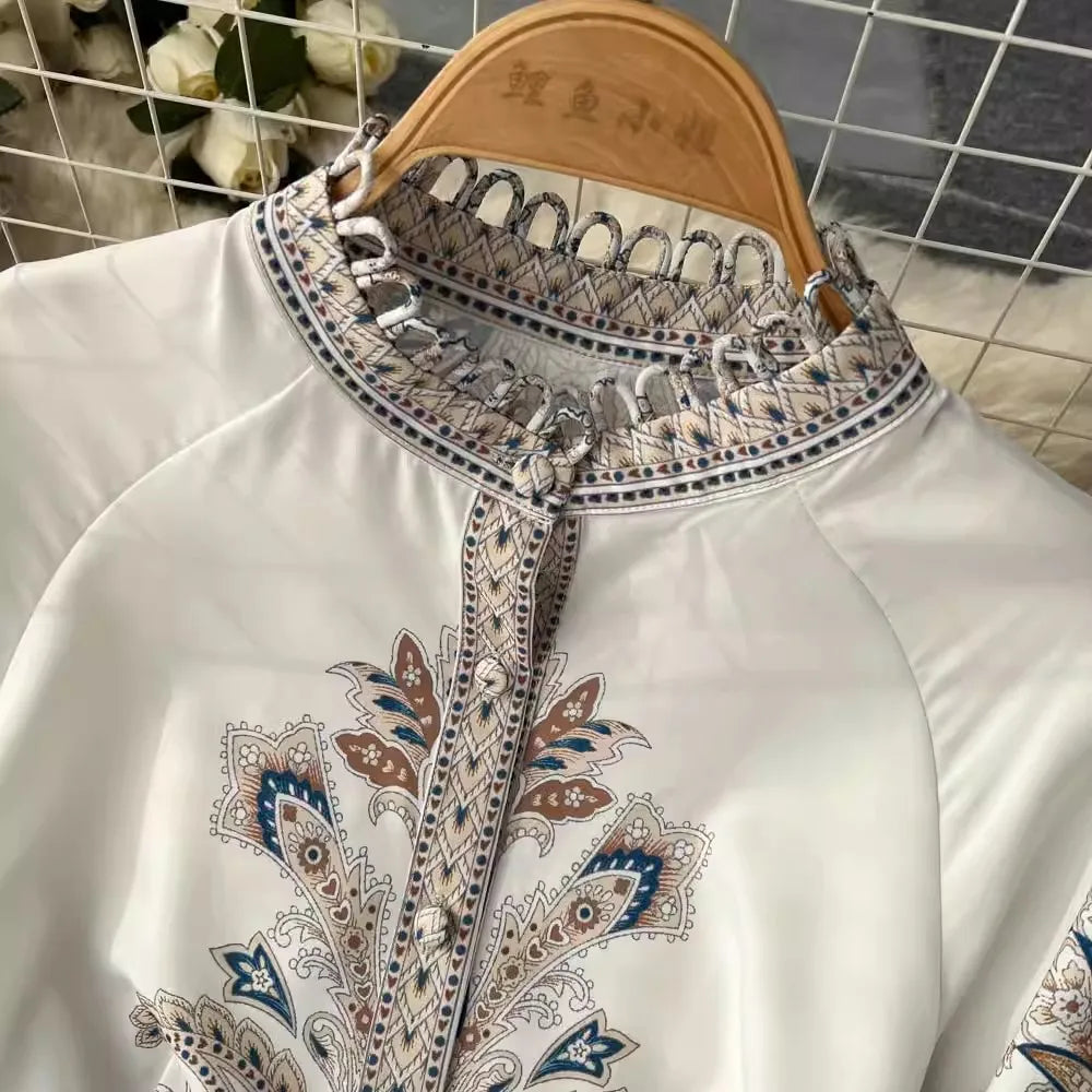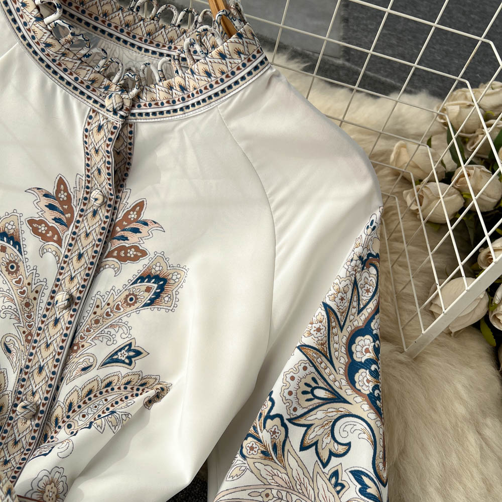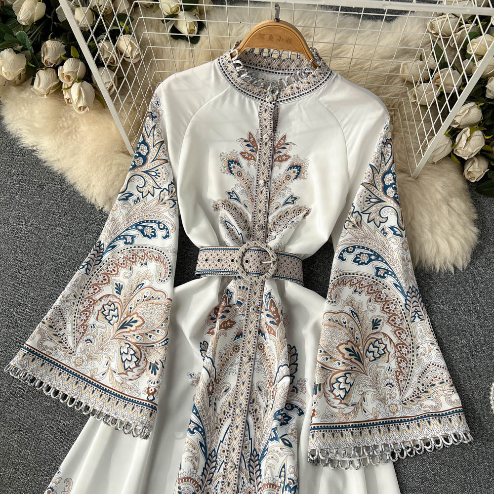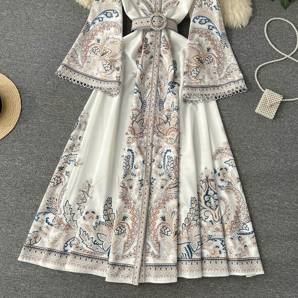 Vintage Print Robe Paisley Maxi Dress Lantern Sleeve