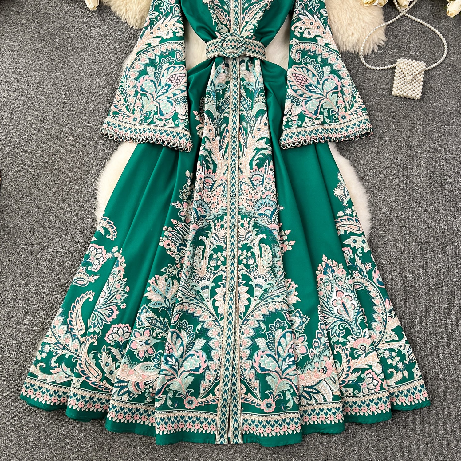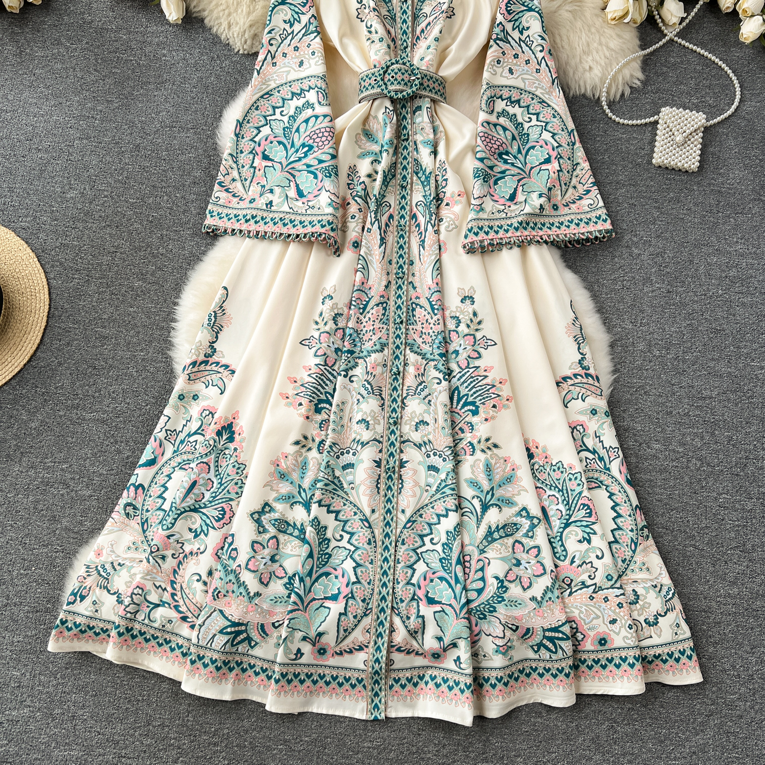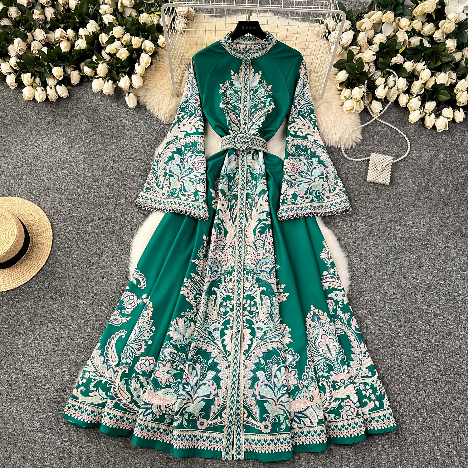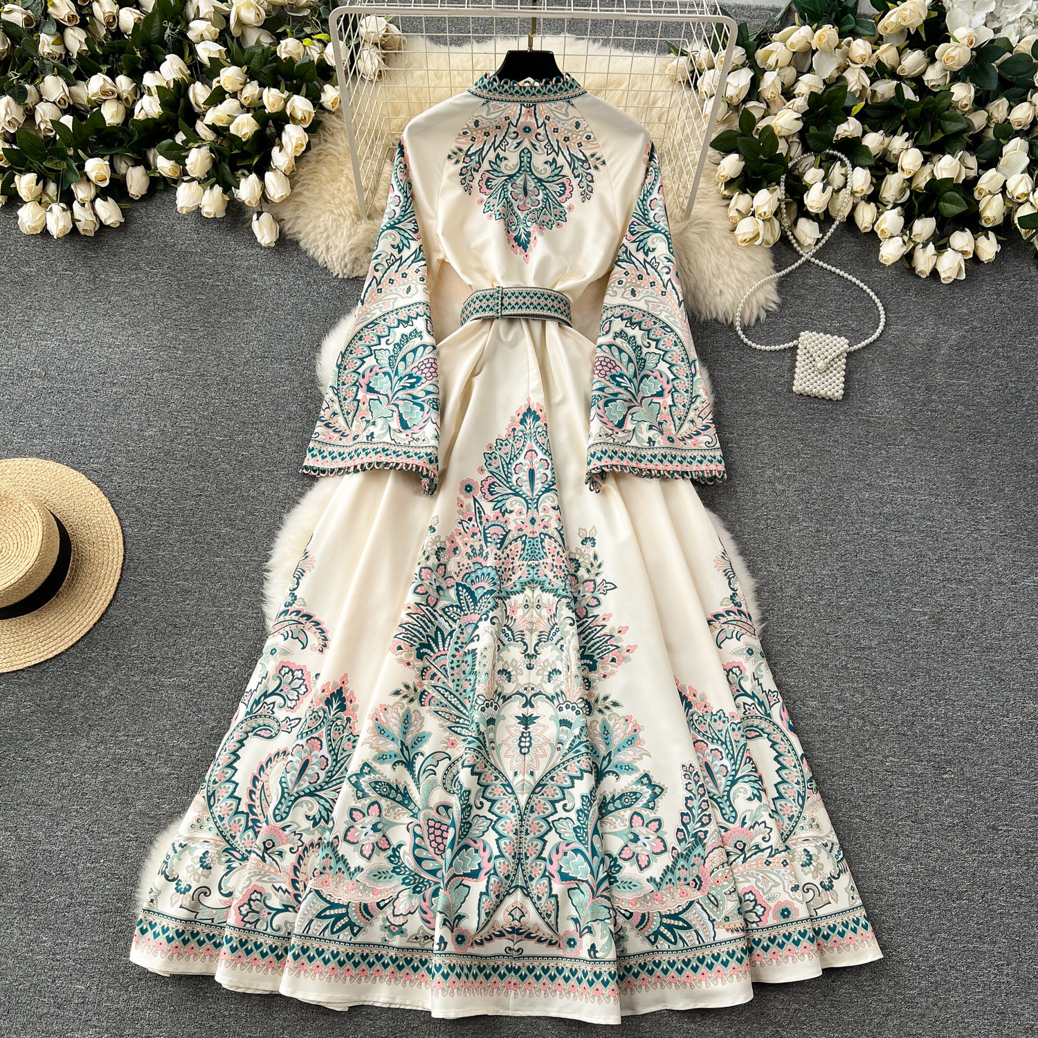 Discover the luxurious and elegant Autumn Vintage Print Robe Paisley Maxi Dress, featuring lantern sleeves and a figure-flattering slim waistband belt. Made from a blend of high-quality polyester and linen, this dress is perfect for any occasion. Its single-breasted closure and ankle-length hem create a classic and sophisticated silhouette, while the intricate print adds a touch of vintage charm. Experience the passion and value of this dress, available in a variety of sizes for women of all ages. Don't miss out on this must-have piece for your wardrobe.