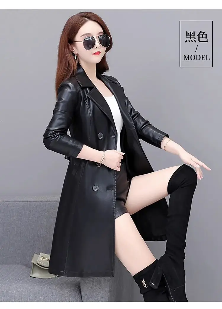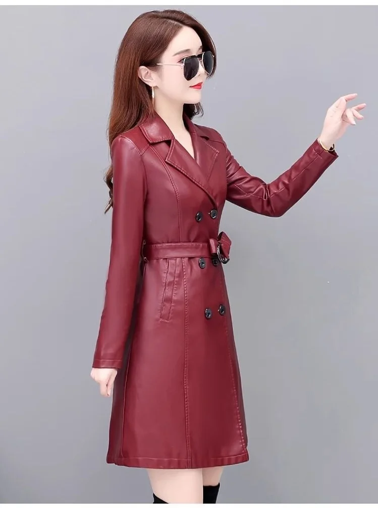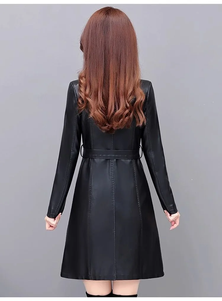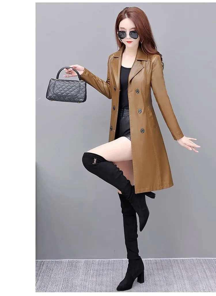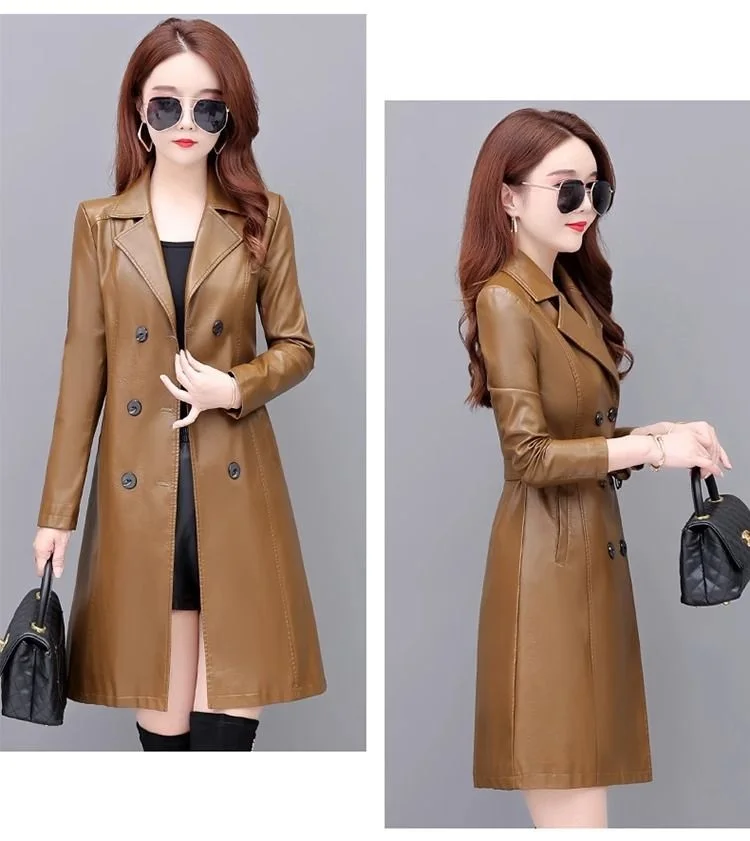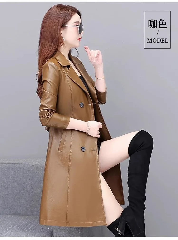 This mid-length leather jacket for women combines chic Korean style with practical design, perfect for autumn and winter. Featuring a double-breasted closure and a turn-down collar, it offers a flattering slim fit. Crafted from PVC material, it includes pockets and buttons for added detail. Available in sizes M to 4XL, this casual jacket provides full sleeves and comfortable wear, making it an excellent choice for middle-aged women seeking both style and warmth.