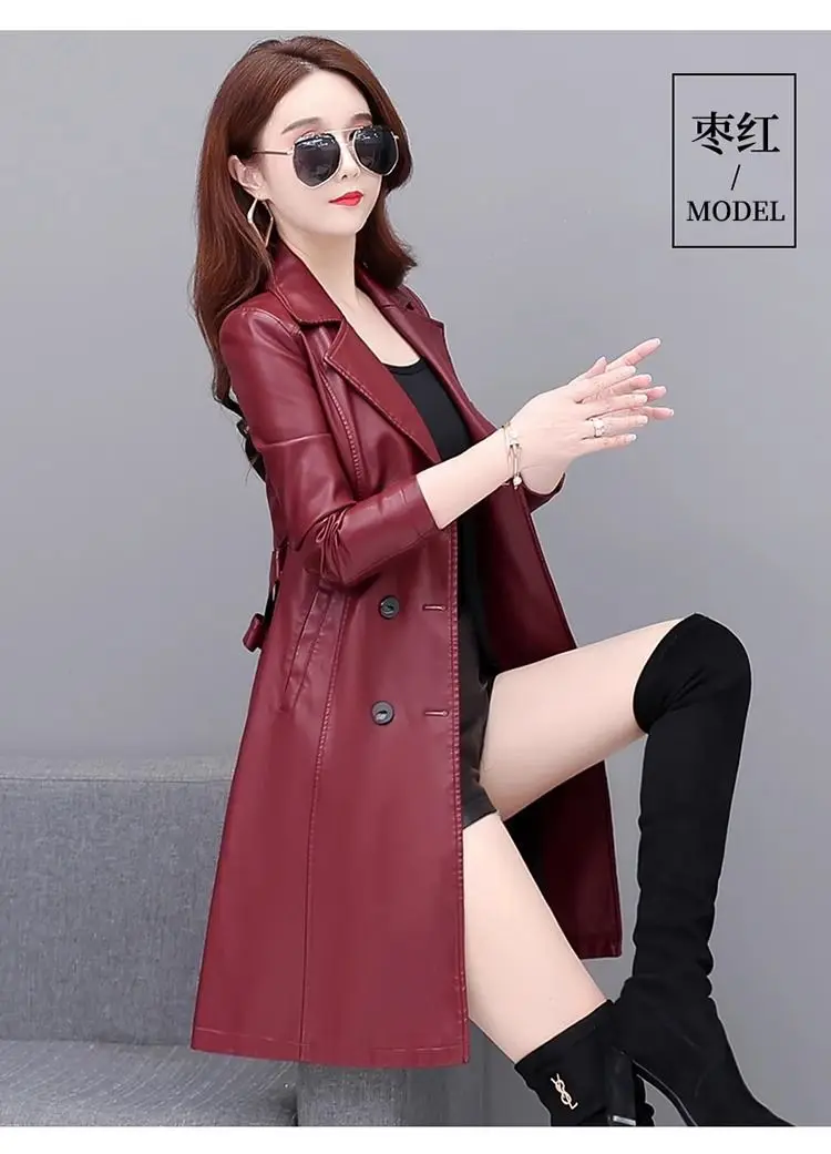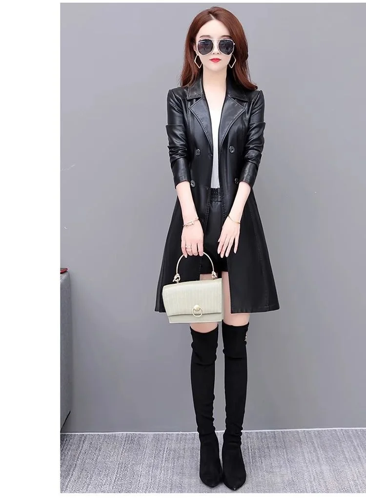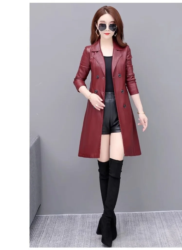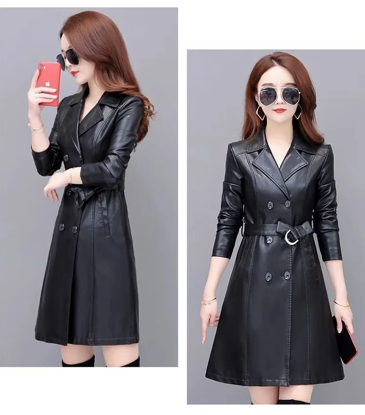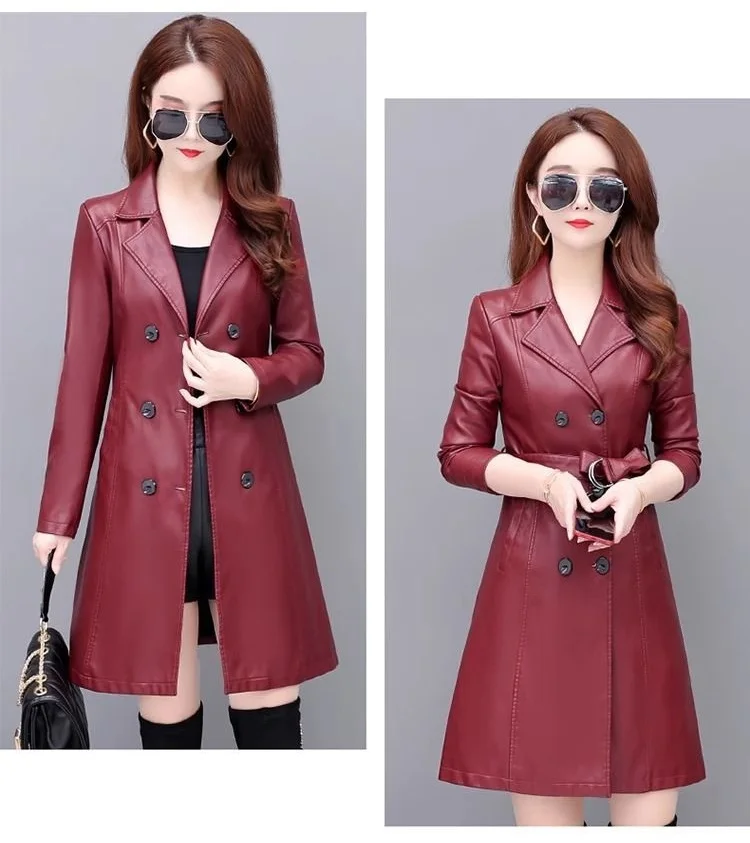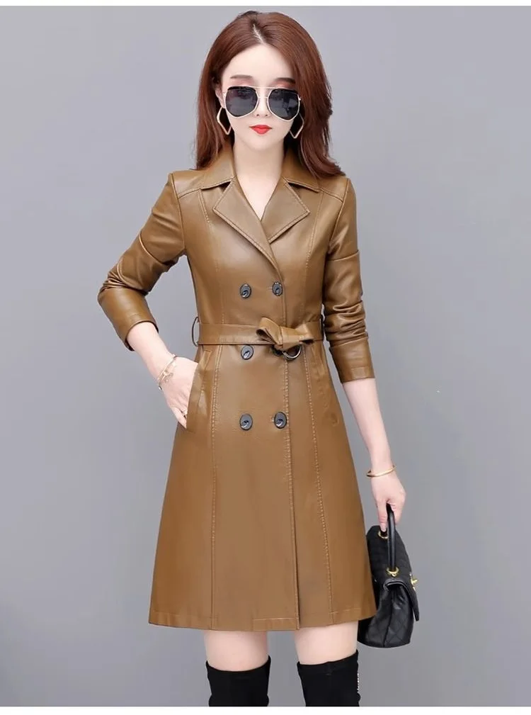 This mid-length leather jacket for women combines chic Korean style with practical design, perfect for autumn and winter. Featuring a double-breasted closure and a turn-down collar, it offers a flattering slim fit. Crafted from PVC material, it includes pockets and buttons for added detail. Available in sizes M to 4XL, this casual jacket provides full sleeves and comfortable wear, making it an excellent choice for middle-aged women seeking both style and warmth.