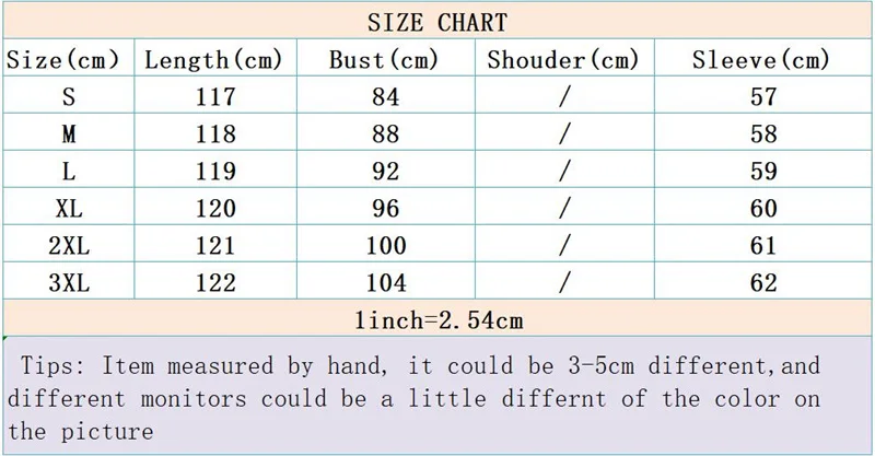 size_info: {"sizeInfoList":[{"length":{"cm":"117","inch":"46.06"},"size":"S","vid":-42},{"length":{"cm":"118","inch":"46.46"},"size":"M","vid":-43},{"length":{"cm":"119","inch":"46.85"},"size":"L","vid":-44},{"length":{"cm":"120","inch":"47.24"},"size":"XL","vid":-45},{"length":{"cm":"121","inch":"47.64"},"size":"2XL","vid":-46},{"length":{"cm":"122","inch":"48.03"},"size":"3XL","vid":-47}]}