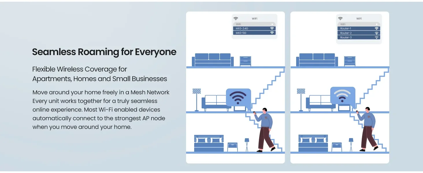 MX3 units work together under one unified network supported by 802.11k/v protocol and AP steering technology, creating seamless roaming experiences. Your devices will automatically connect to the best node as you move around in your house.