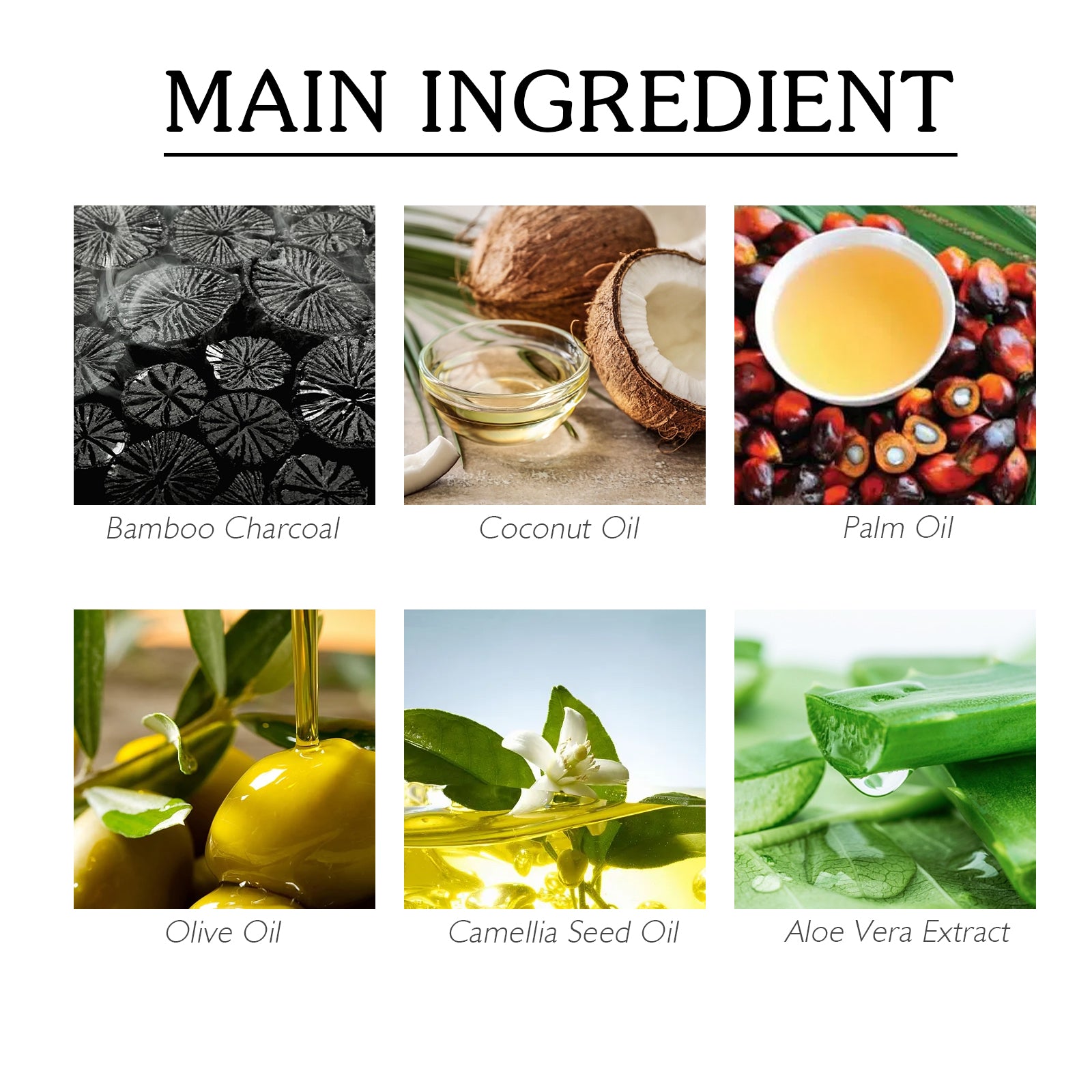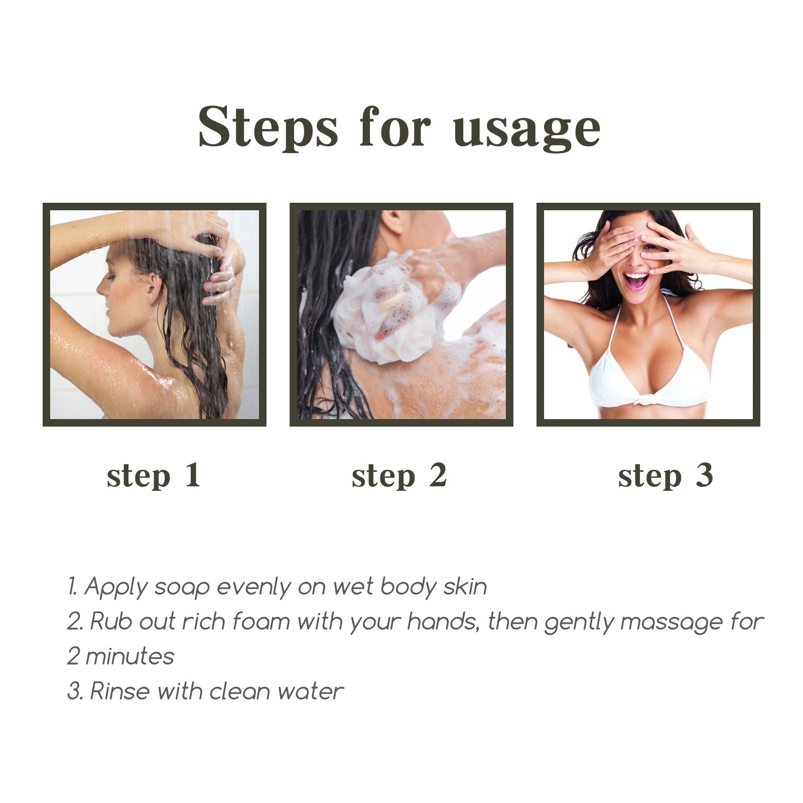 Our bamboo Charcoal Black Bark whitening soap contains bamboo charcoal, olive oil, aloe vera extract. It can help moisturize the skin, thereby reducing dryness and pigmentation, leaving the skin looking healthier and with a more even complexion. Its use method is very simple: first of all, the soap is evenly applied to the wet body skin, then the hand rub out a rich foam, then gently massage for 2 minutes, and finally rinse with water, which helps to lighten the dark pigmentation, repair and moisturize the skin, and make the skin tone more even and glowing.