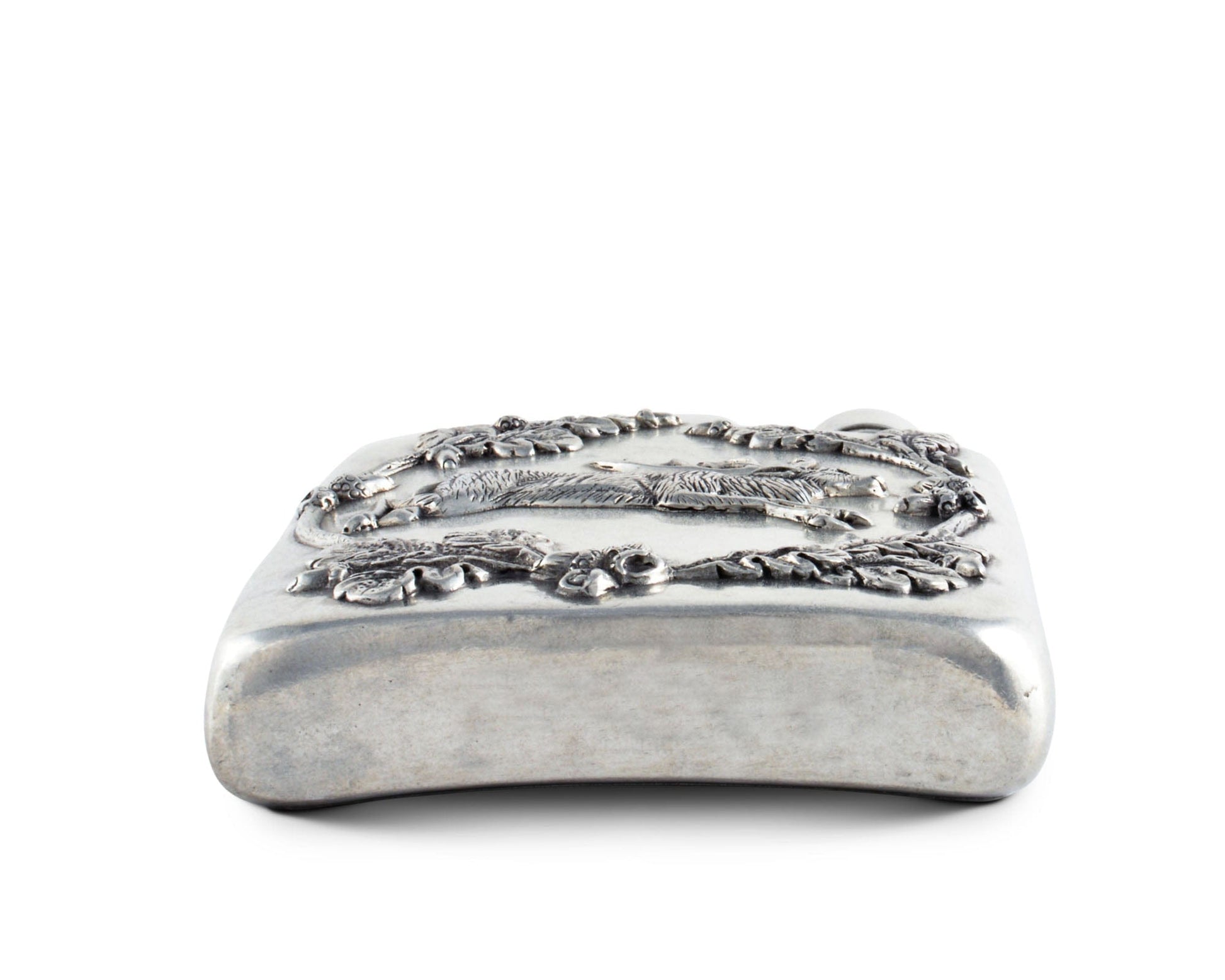 Our Lodge Style Black Forest Pewter Flask is characterized by its handsome Black Forest design and polished finish. Crafted with precision, it features a compelling herringbone graphic pattern and intricate pastoral motifs depicting a jumping elk and winding oak leaves. Delivering just enough of a tipple to get you through the outdoors, the flask's compact size makes it an essential companion for entertaining and adventure. These classic flasks are the perfect Father's Day gift or addition to any gentleman's collection.