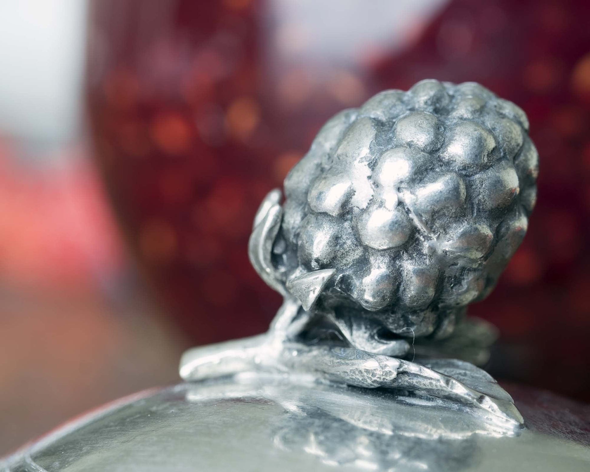 Experience the convergence of elegance and functionality with this Blackberry Jam Jar with Spoon. Crafted with our signature pewter and glass, this luxury gift piece showcases a figural blackberry and leaf design on the cap, making it a unique, stand-out item in your kitchen. Its compact size at 3"W x 5"H, best suited for preserving your favorite jam. The twig-shaped spoon, branching off with more fruit and foliage, fits perfectly in the designated lid gap, blending seamlessly with the exquisite presentation. Ideal for those who value unique kitchen items and love the farmer's market collection.