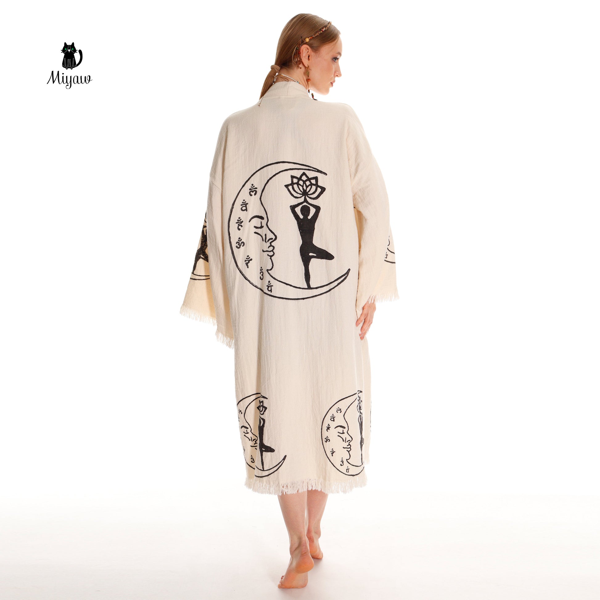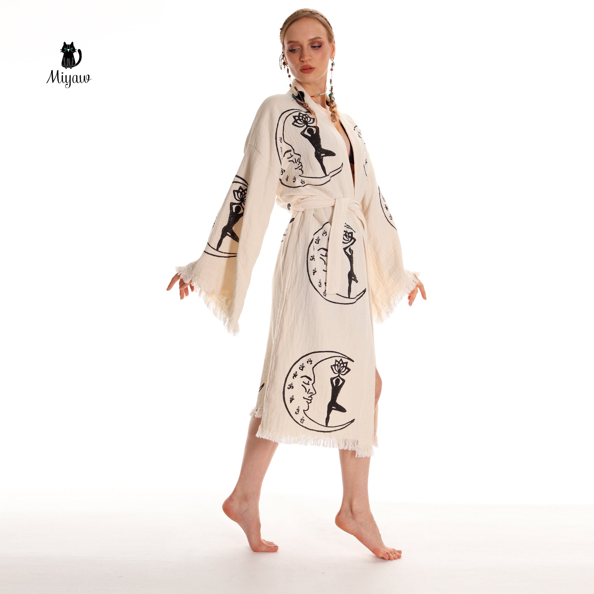 Boho Cotton Kimono Robe – Yoga Girl & Moon Stamp, Organic Loungewear