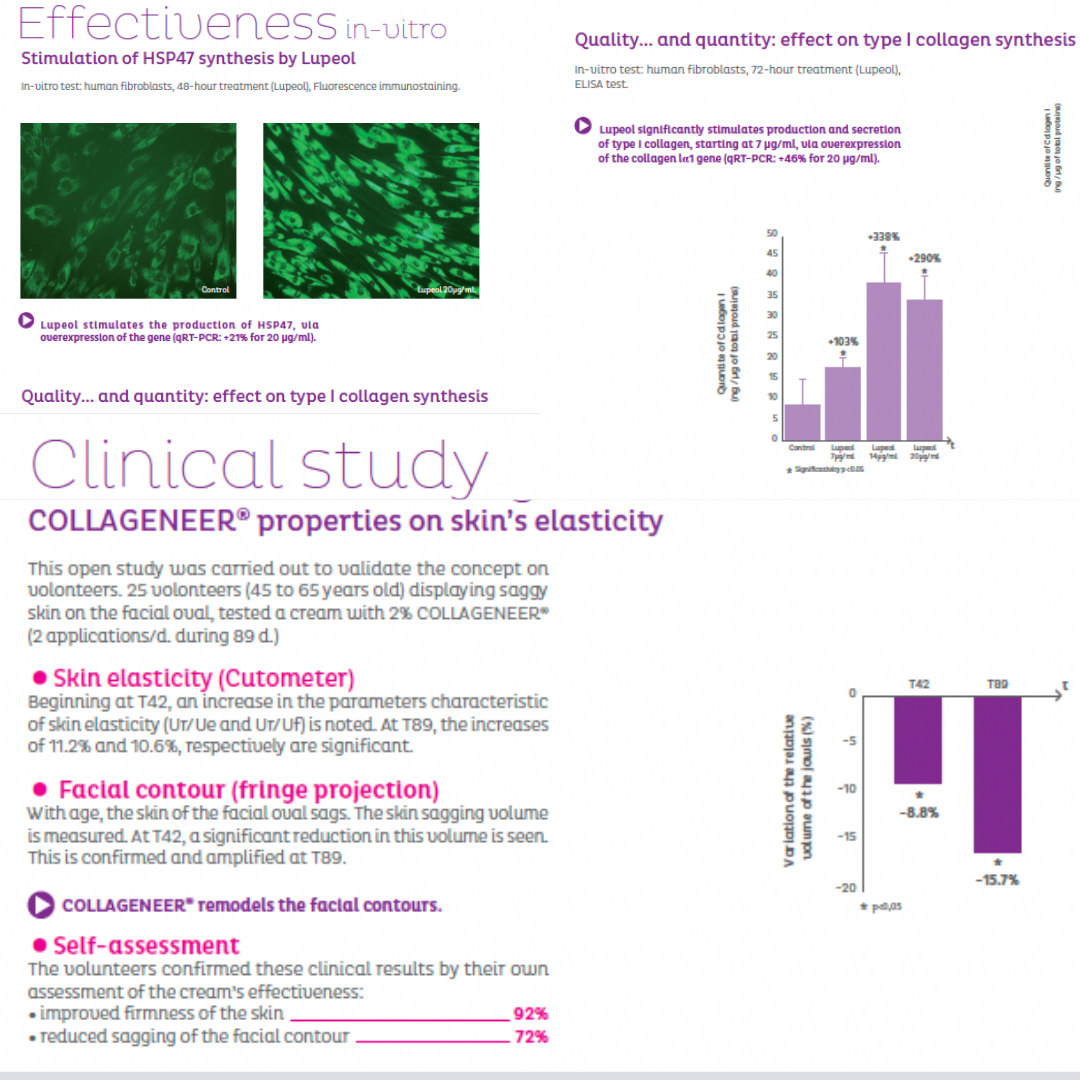 CELLACTIVE® – is an active ingredient extracted from the sweet white lupine seed coatings (lupeol) from a patented process; it has been shown to stimulate the synthesis of high-quality collagen I, improve elasticity, firmness, and remodel sagging skin areas with consistent use in an 8-12 weeks study.