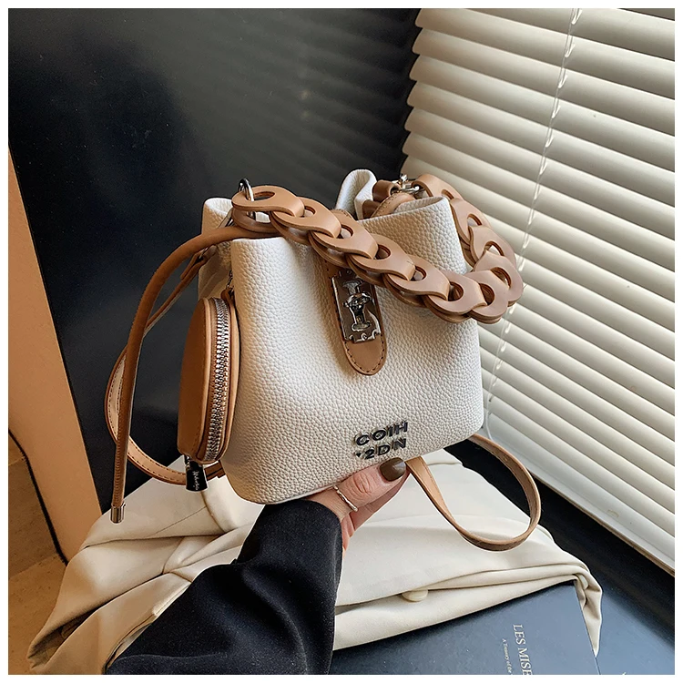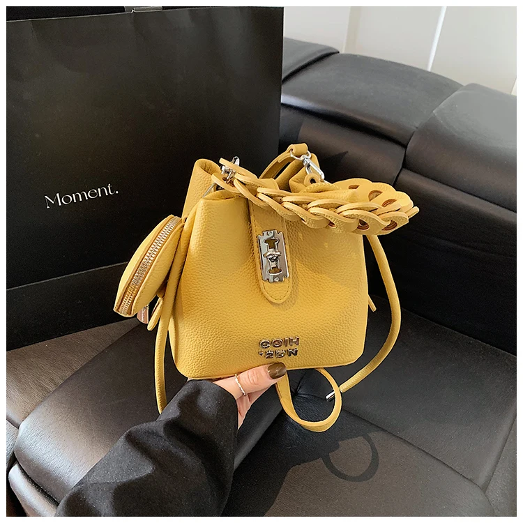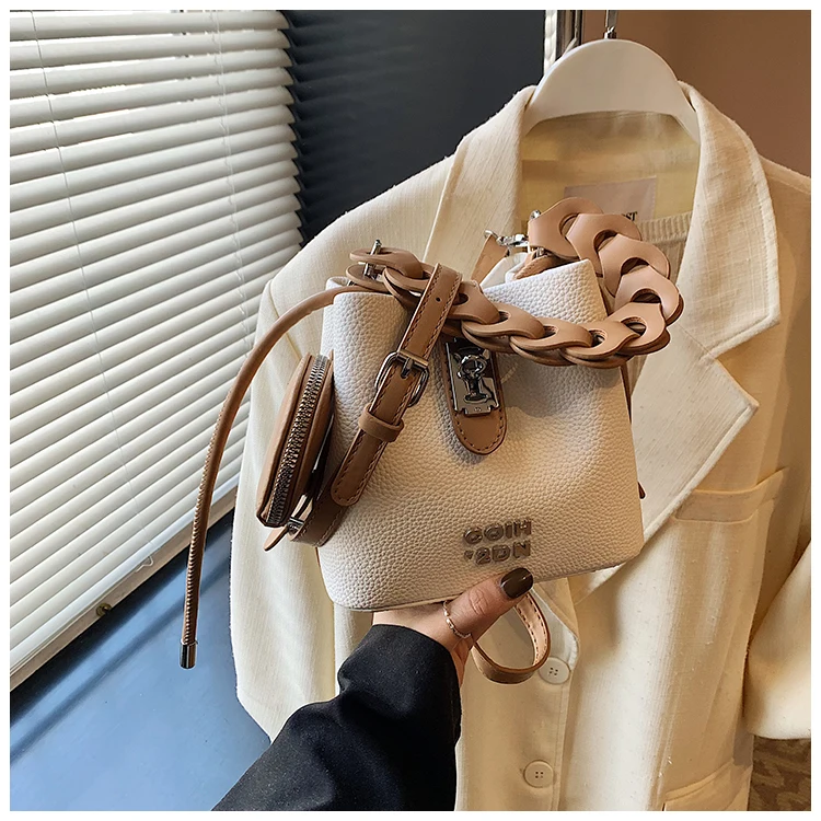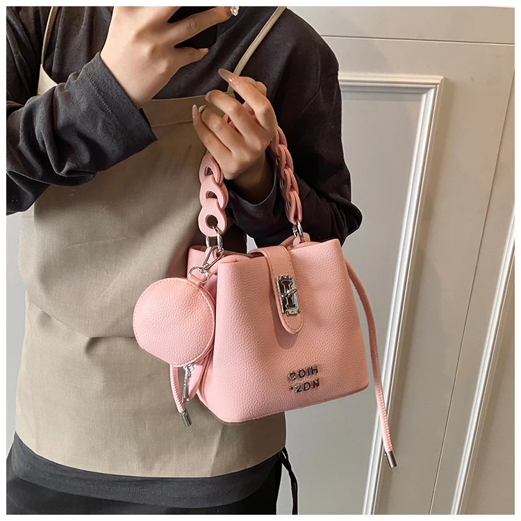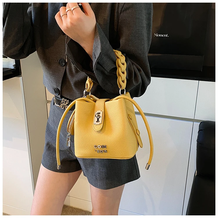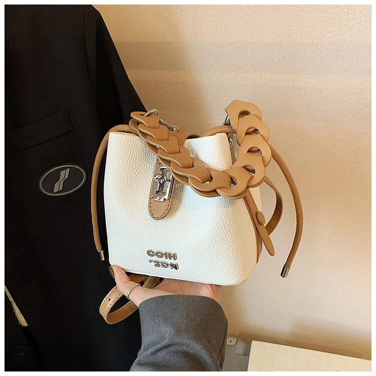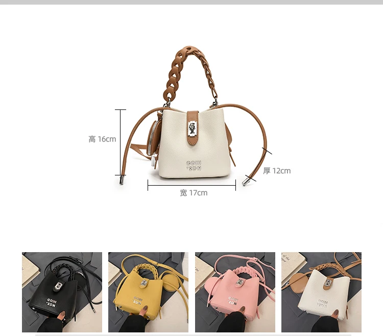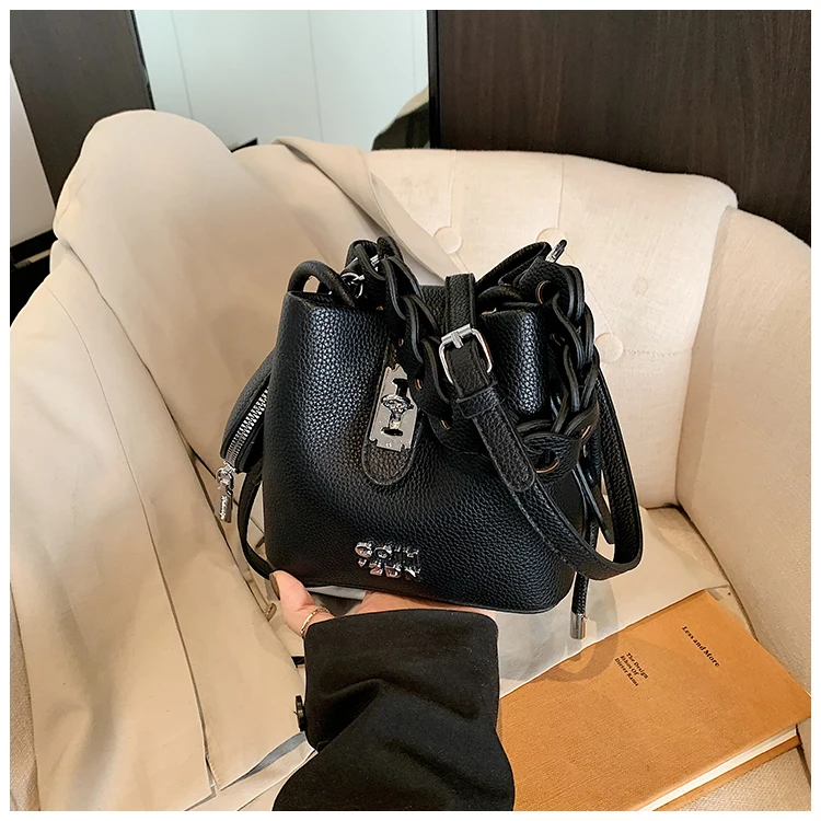 This soft PU bucket bag is designed for women and suitable for all seasons. Featuring a secure hasp closure and a solid exterior with a stylish letter decoration, it offers a versatile accessory for various occasions. The bag measures 16 cm in height, 17 cm in length, and 12 cm in width, with a lightweight design for comfortable wear. Inside, it has no pockets but is lined with durable polyester. This fashionable bucket bag combines practicality with a modern look.