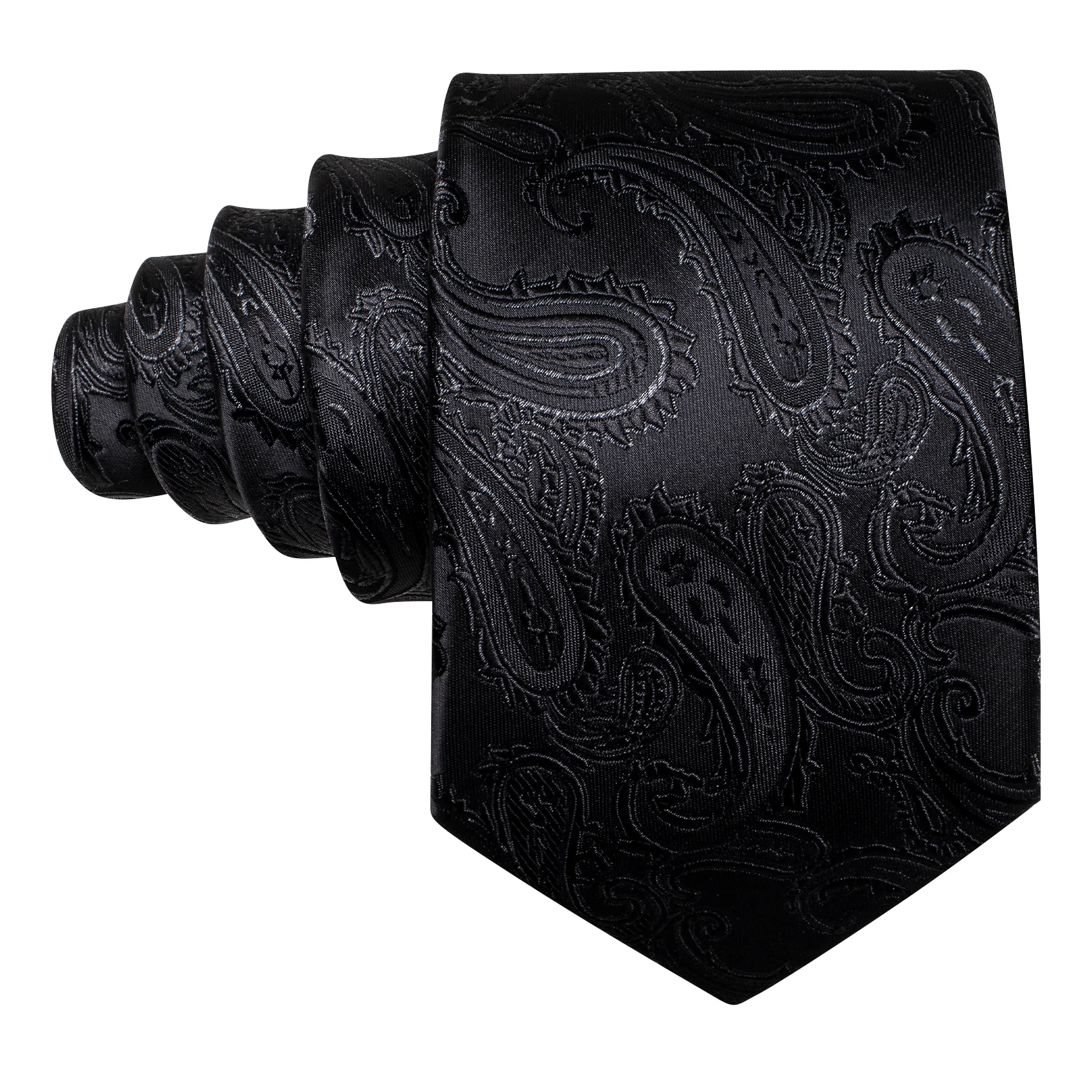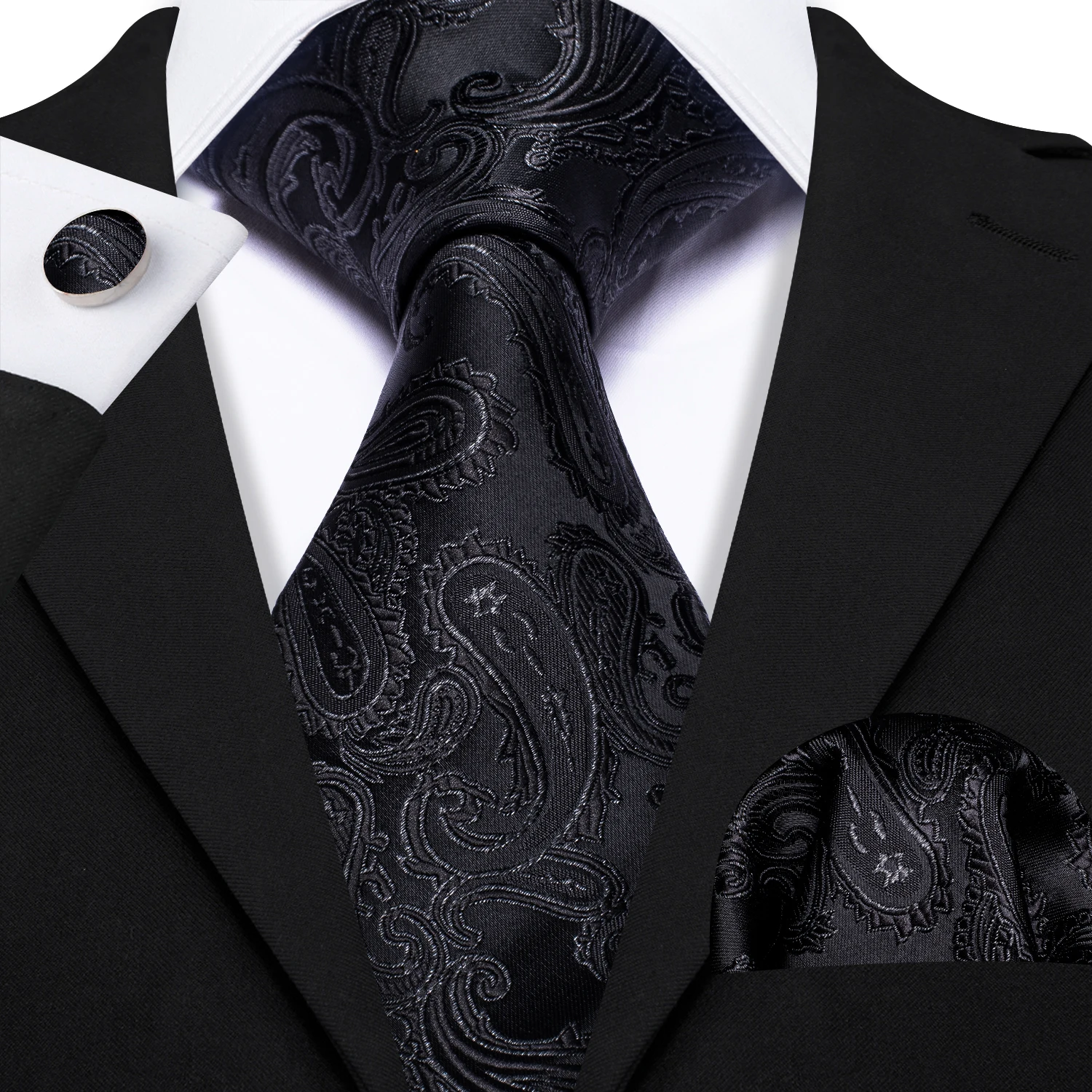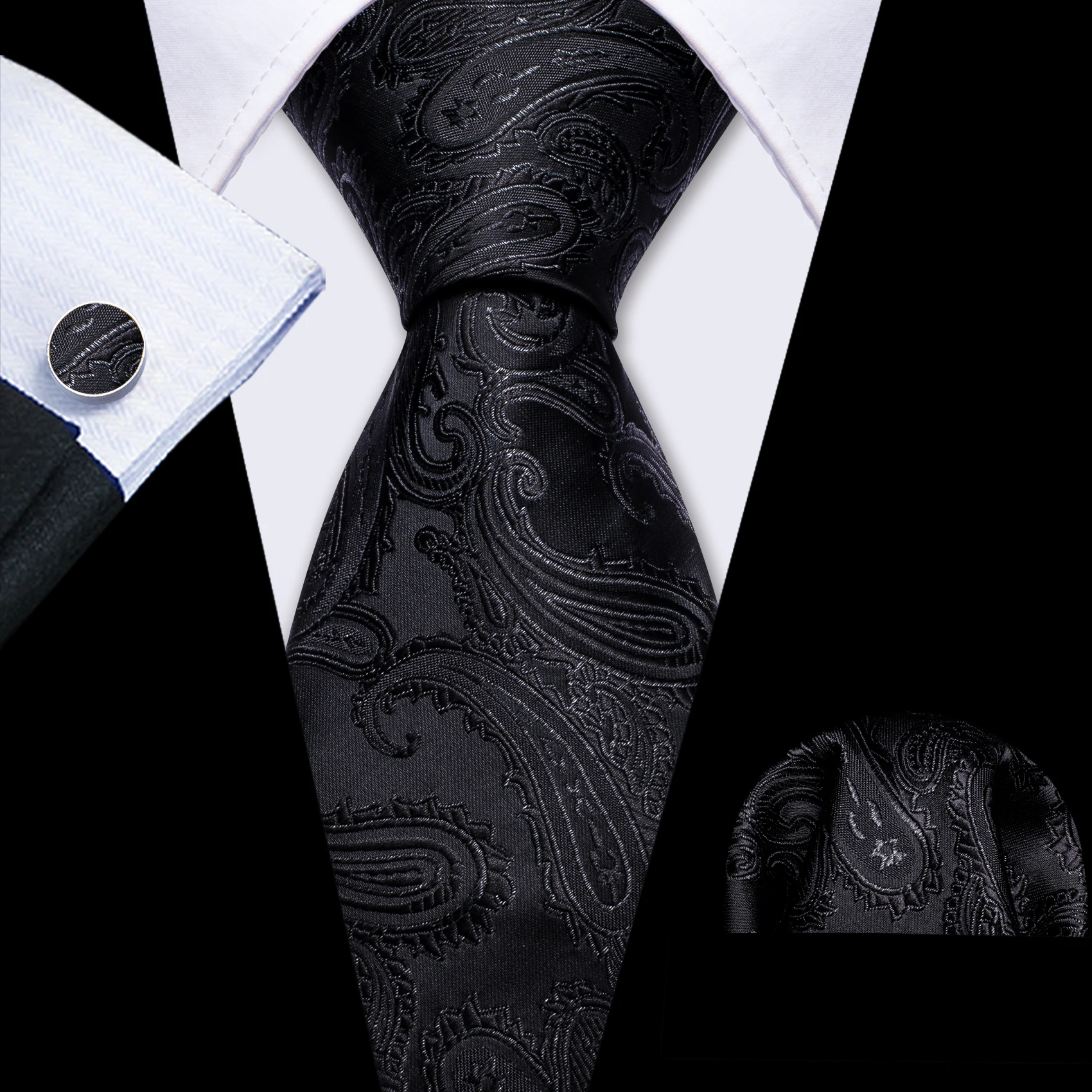 Business Black Silk Ties For Men Classic Solid High Quality Woven Pocket Square Cufflinks Sets Party Formal Designer Barry Wang