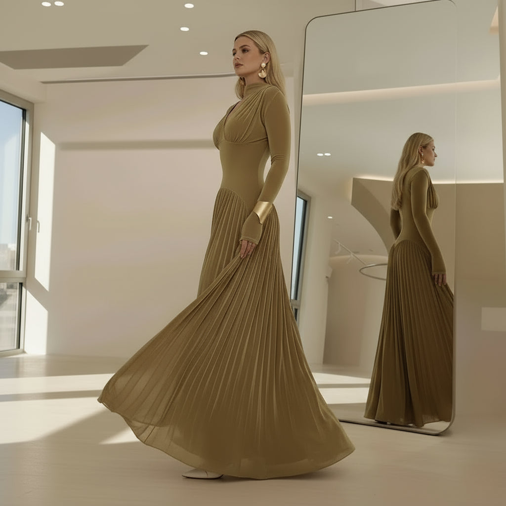 Casual High Waist Long Sleeved Velvet Dress V Neck Solid Color Slim Fit Pleated