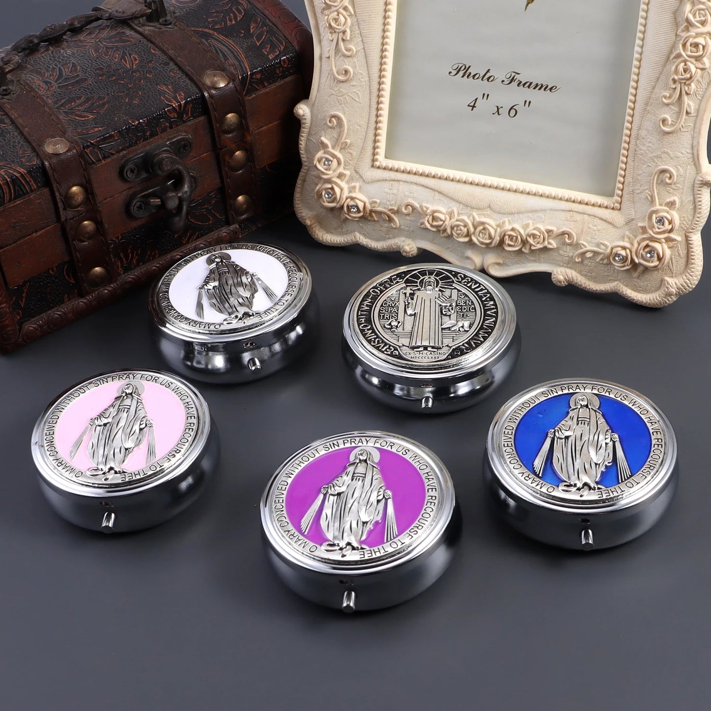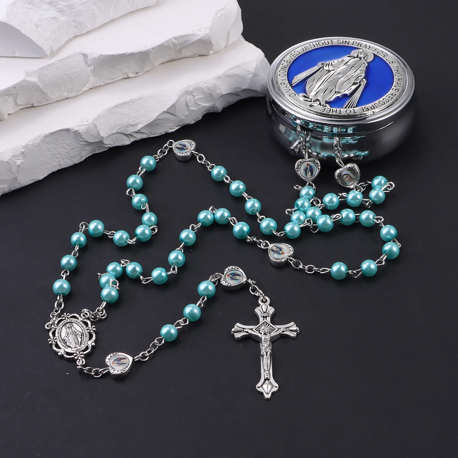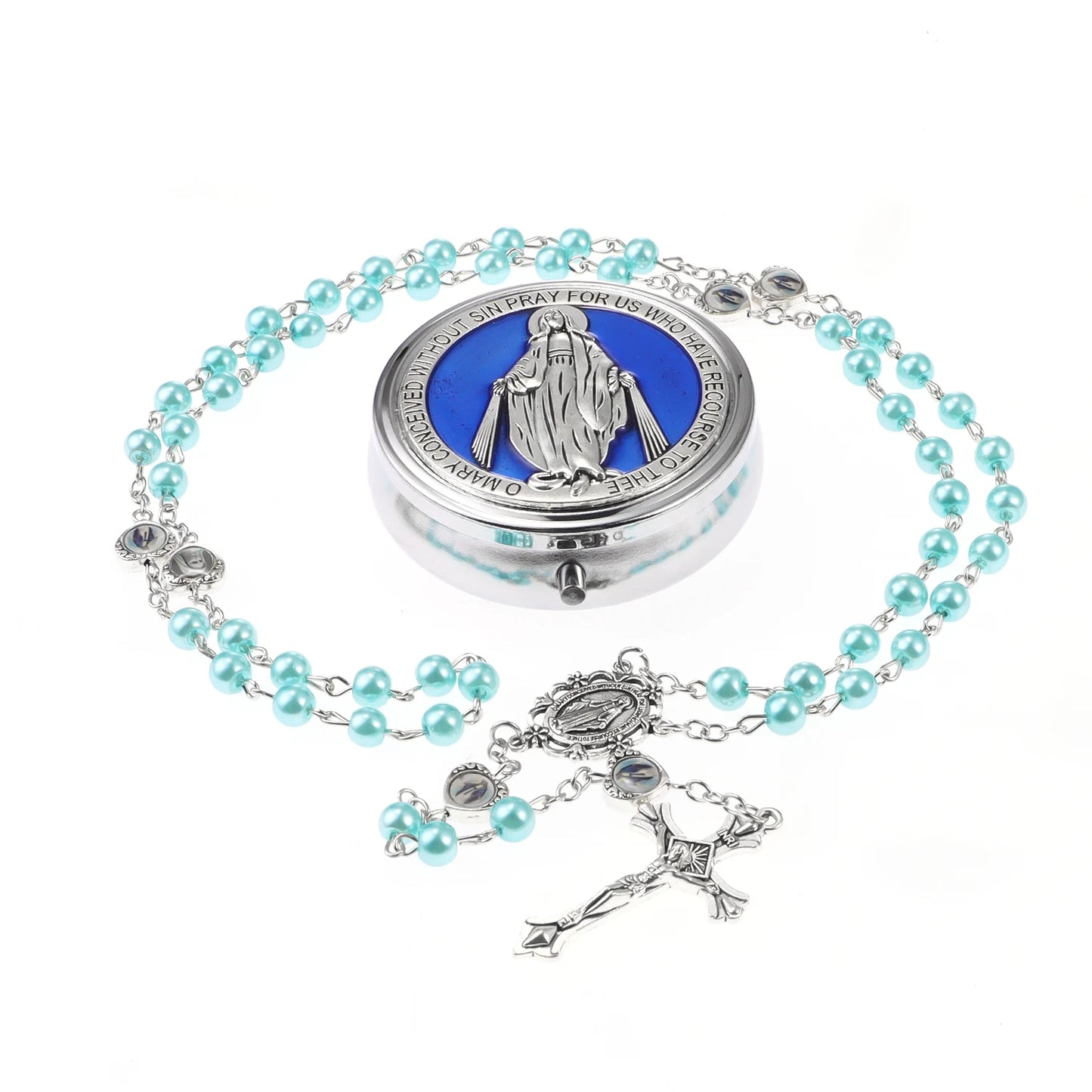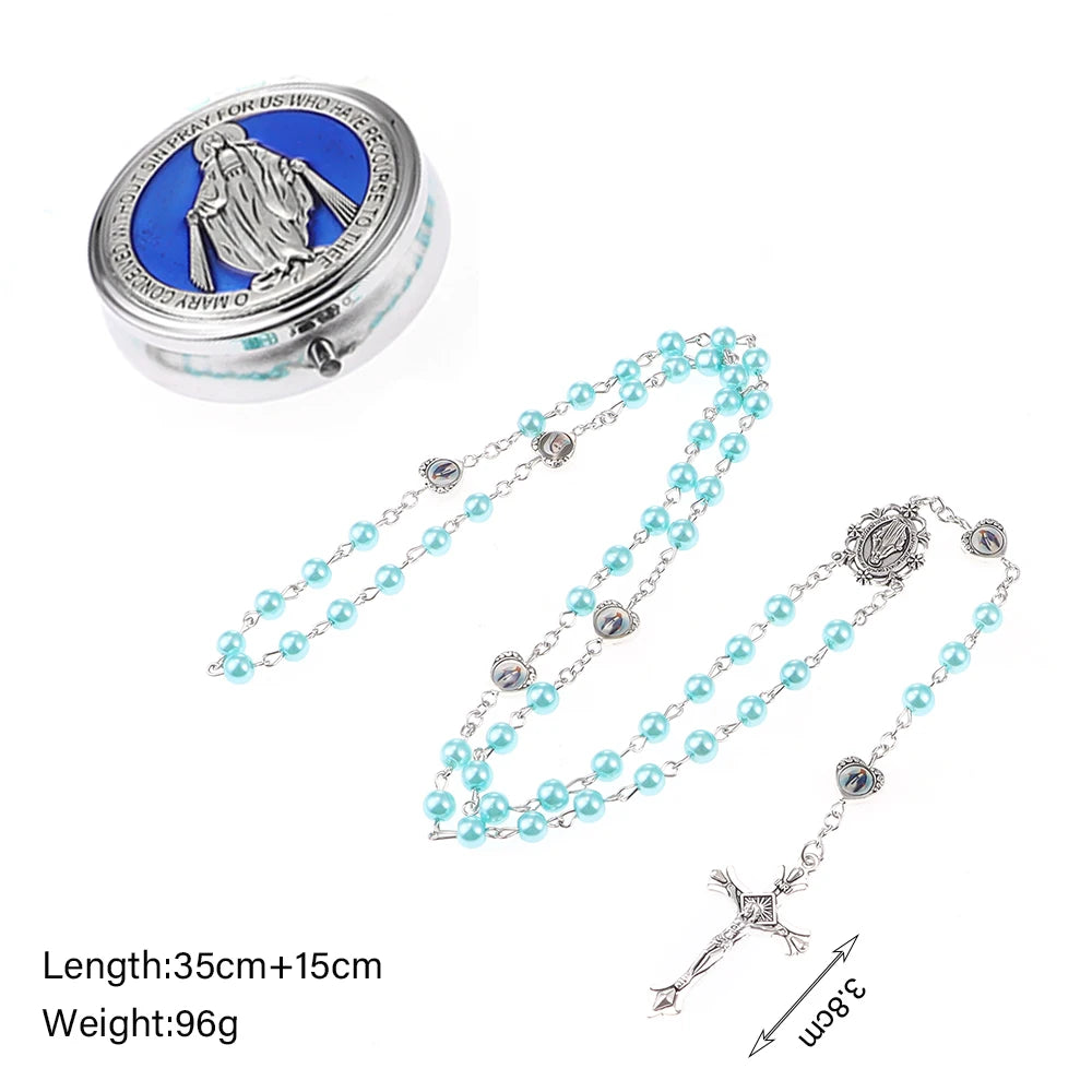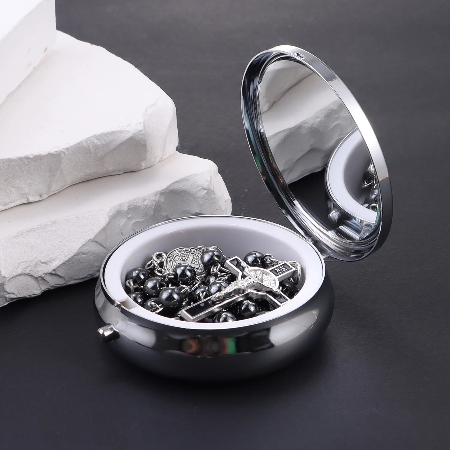 Product advantages: 1. Exquisite metal jewelry box with patterns of the Virgin Mary or Saint Benedict in different colors. The box contains a mirror, which can be carried with you, making it convenient for travel and daily prayer. 2. The prayer beads are glass beads of different colors, which have a smooth hand feel and display high quality when worn.