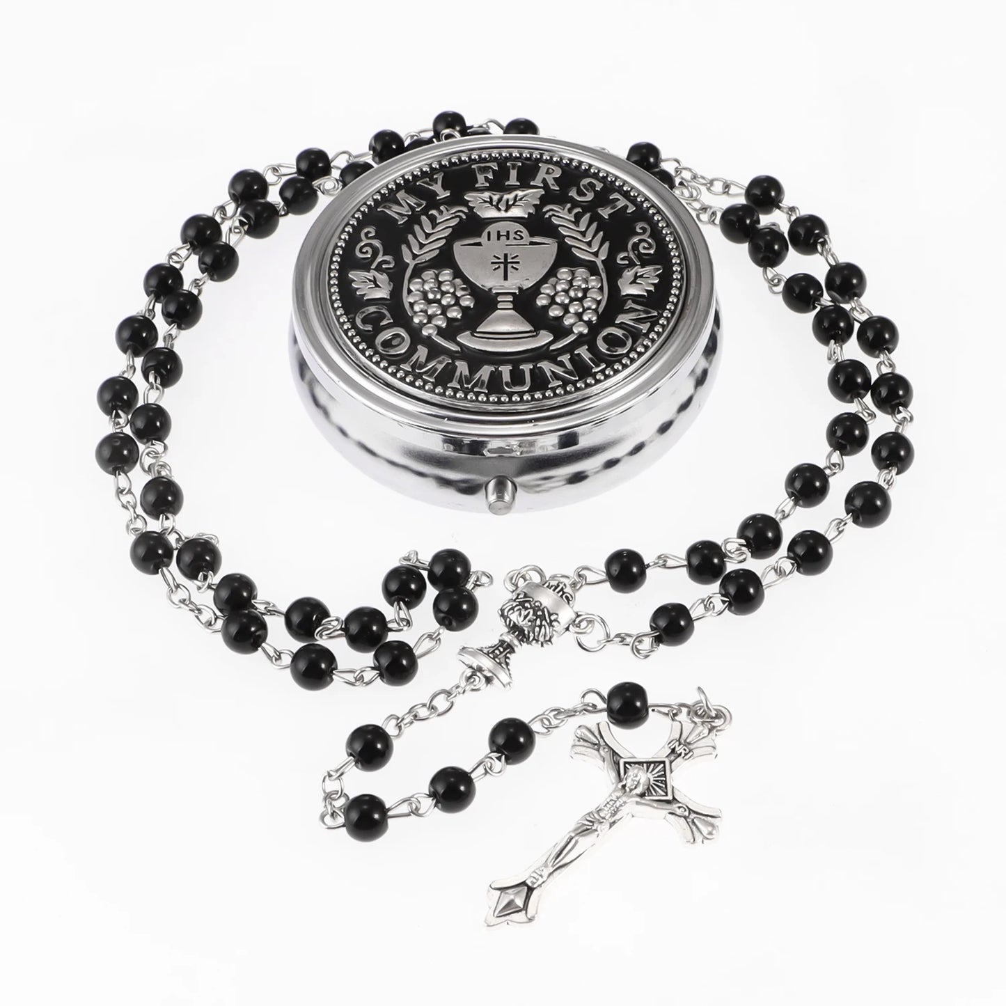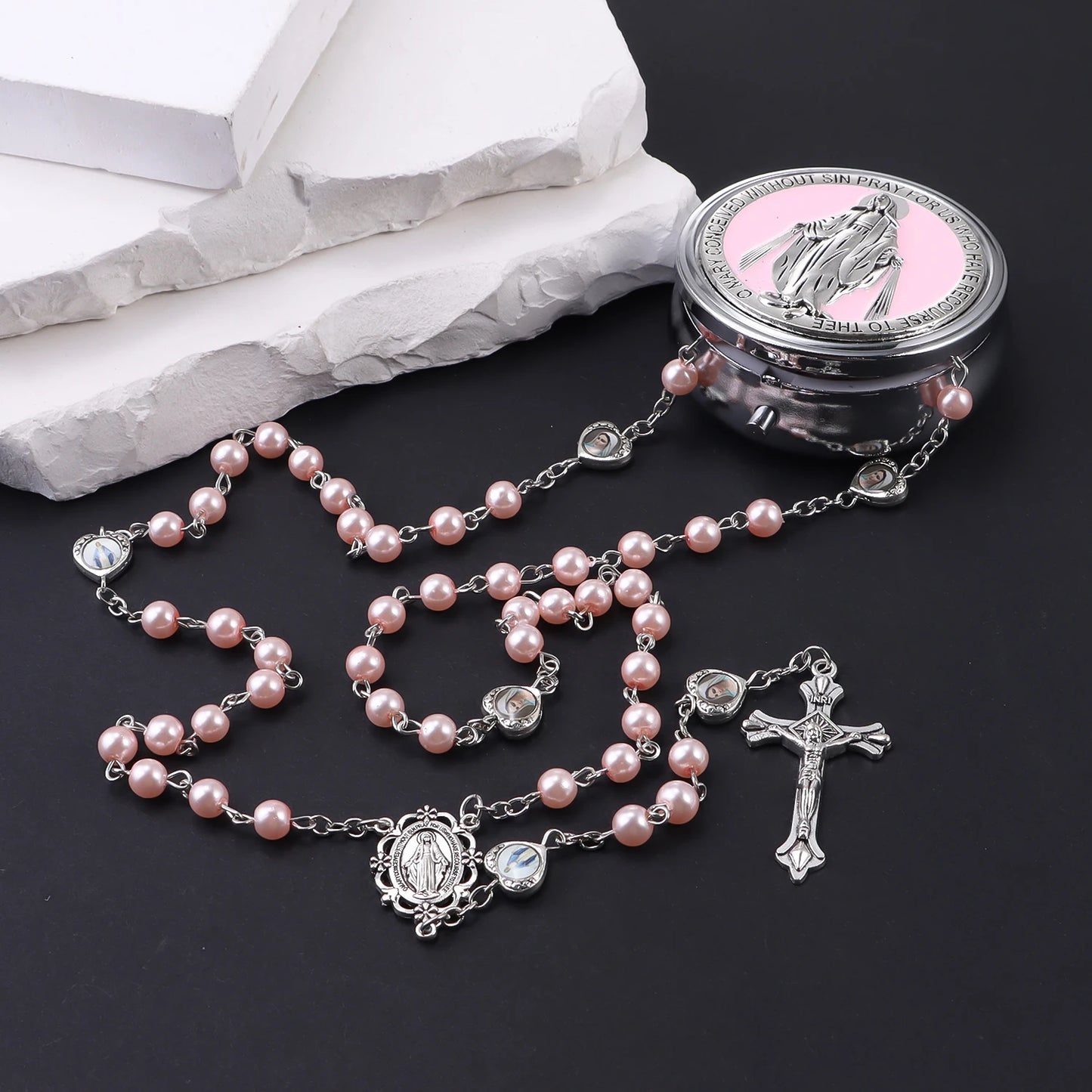 This Catholic Rosary Box Necklace Prayer Beads is a stunning accessory that is sure to enhance your faith and fashion. Crafted with high-quality metal materials, including Zinc Alloy and Iron alloy, this necklace boasts a beautifully round pendant design that is perfect for both men and women. As a meaningful symbol of your devotion, it also serves as a functional Mood Tracker. Whether you wear it for special occasions or as an everyday reminder of your religious beliefs, this necklace is a powerful choice. Adding to its appeal is its compatibility with all styles and its chemical-free construction. Discover the spiritual significance and fashionable versatility of this Rosary necklace today!