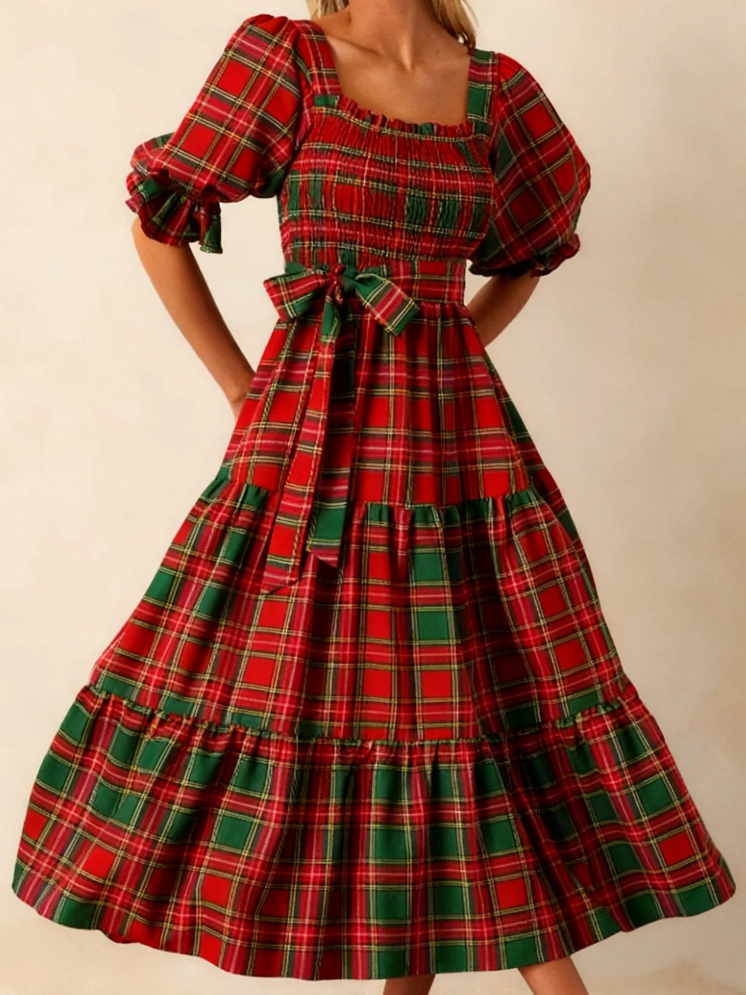 Christmas Classic Plaid Print Square Neck Puff Sleeve A Line Long Dress with Bow Decor Club Party Dresses