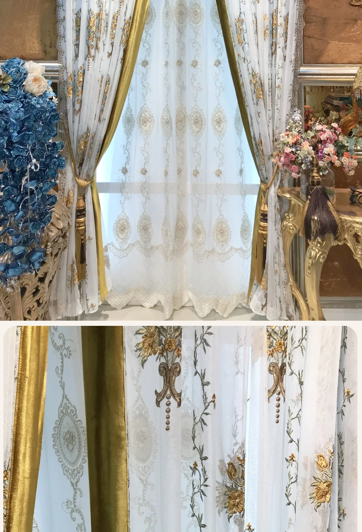 European Elegant Yellow Embroidery Tulle Curtains for Living Dining Room Bedroom - White Ladder Rope Translucidus