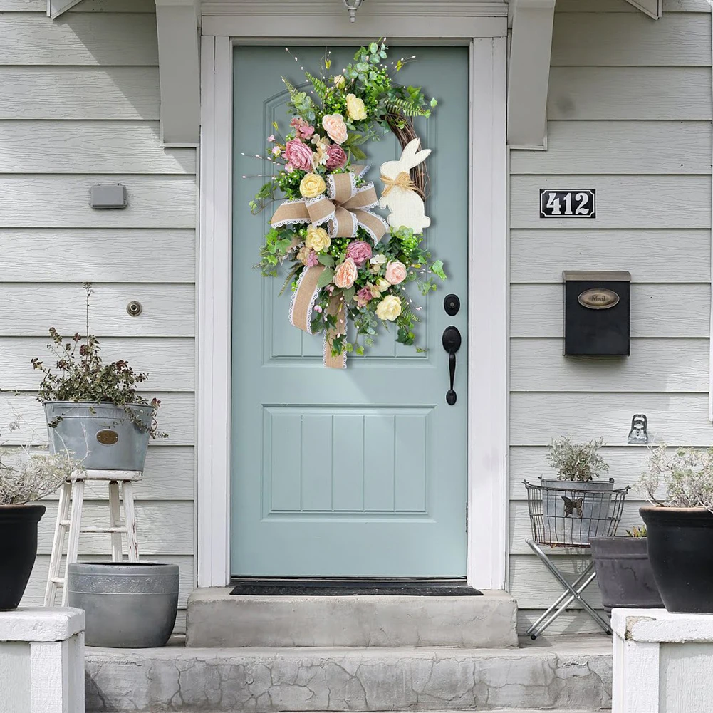 Easter Bunny Wreath Easter Wreath with Bow Artificial Flower Wreath Hanging Wreath for Home Door Garden Party Holiday Decorations