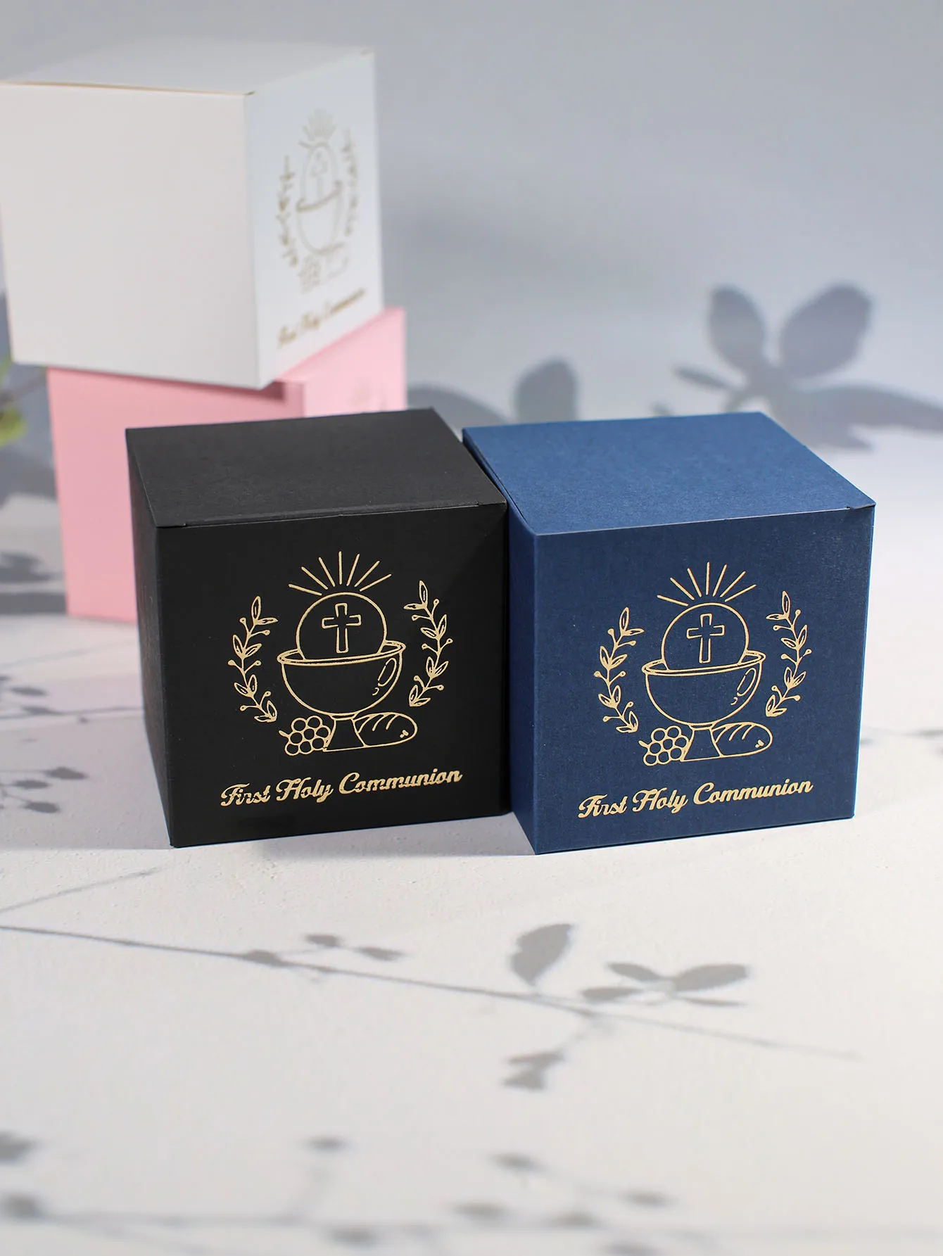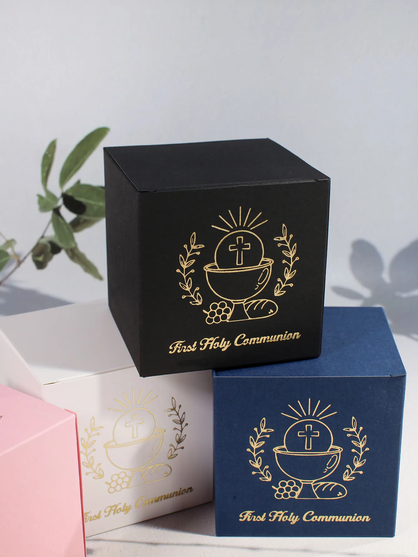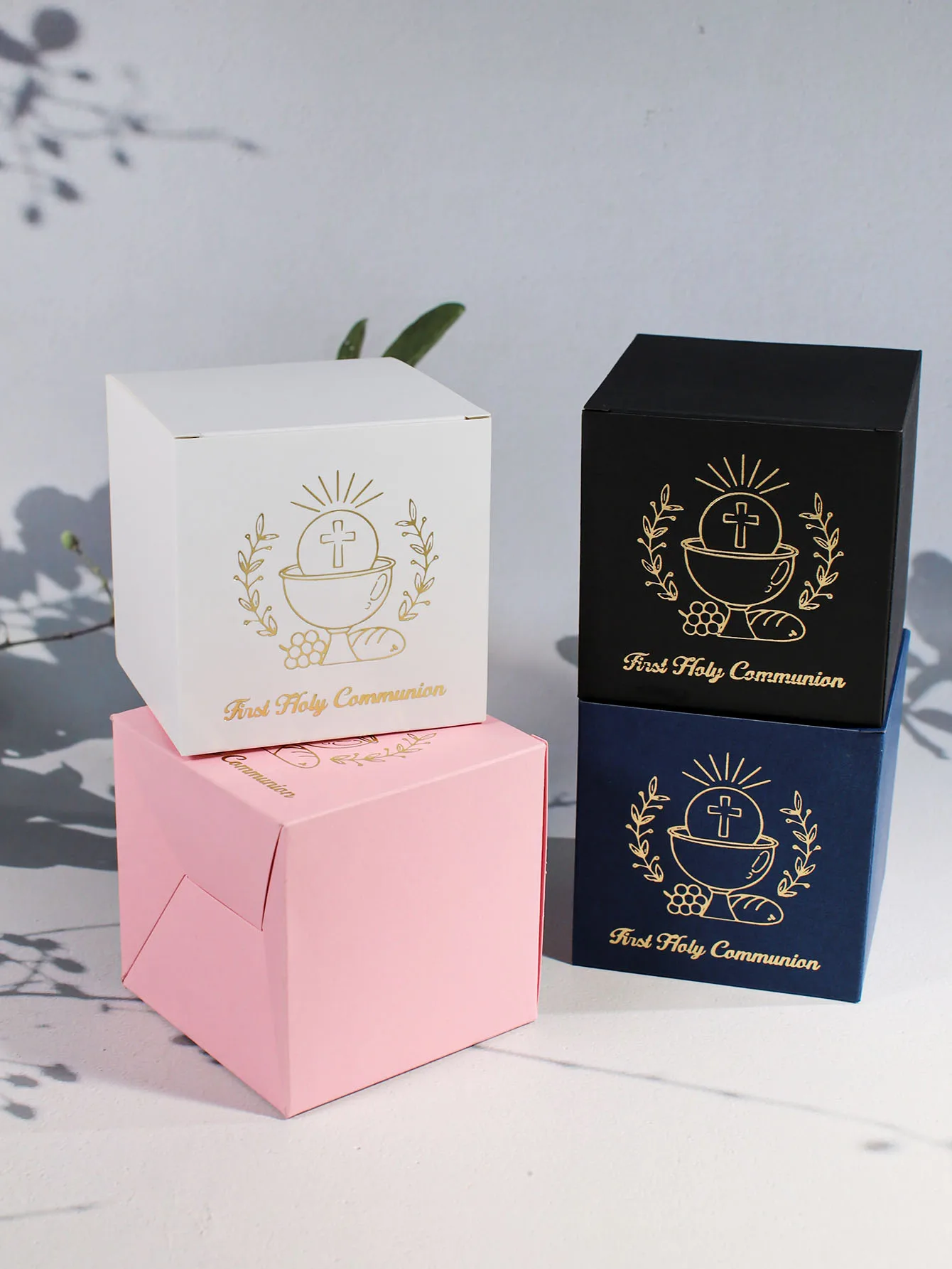 This elegant gift box, featuring a golden Holy Grail and the words "First Communion," is perfect for Christian celebrations. Made from paperboard in Zhejiang, China, it is free from harmful chemicals and customizable. Ideal for christenings, baptisms, parties, and anniversaries, each set includes 20 pieces to make your special occasion memorable.