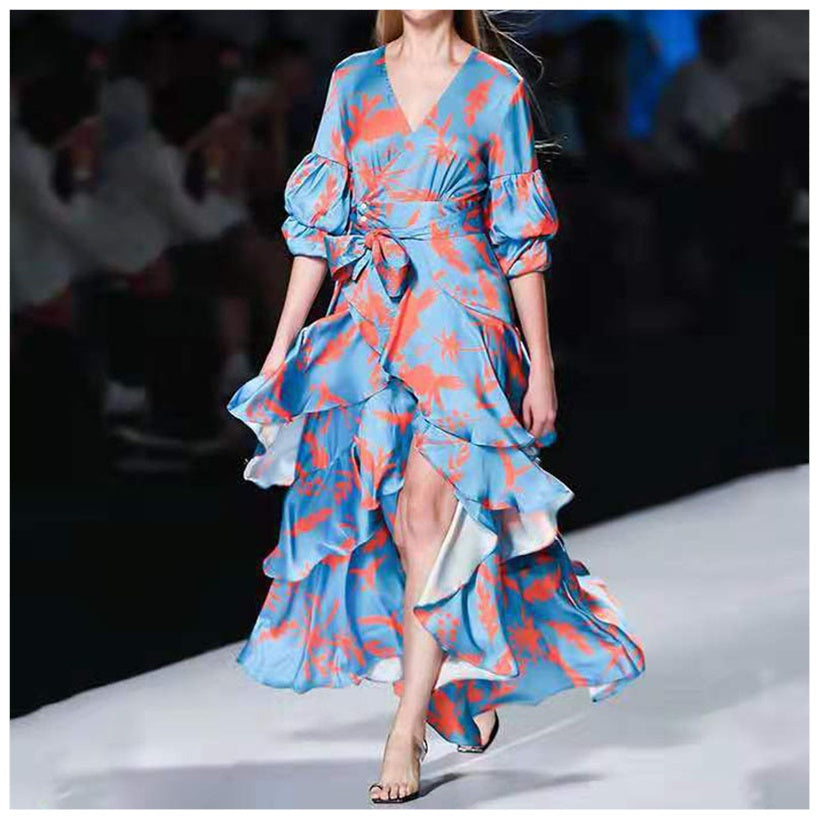 Elegant V-neck Puff Sleeve High Waist Lace-up Ruffled Asymmetrical Flowers Dress