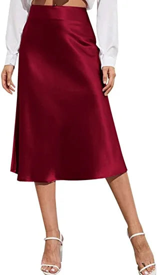 Elegant Women's High Waist Midi A-line Skirt Solid Color Satin Zipper