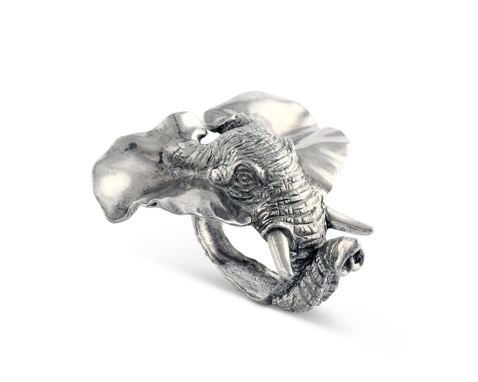 Bring the African wilderness into your home with this best detailed elephant napkin ring for a Safari themed party. Crafted with amazing precision in pure pewter, this unique gift safari collection elephant napkin ring features an impressively tusked elephant. Wildlife artist Helen Richard contributed to the stunning details, making it a must-have item for anyone looking to give a touch of personality and elegance to their table setting. The generously-sized ring at 3"W x 2.5"L x 2"T inches will accommodate a wide variety of napkin styles and sizes.