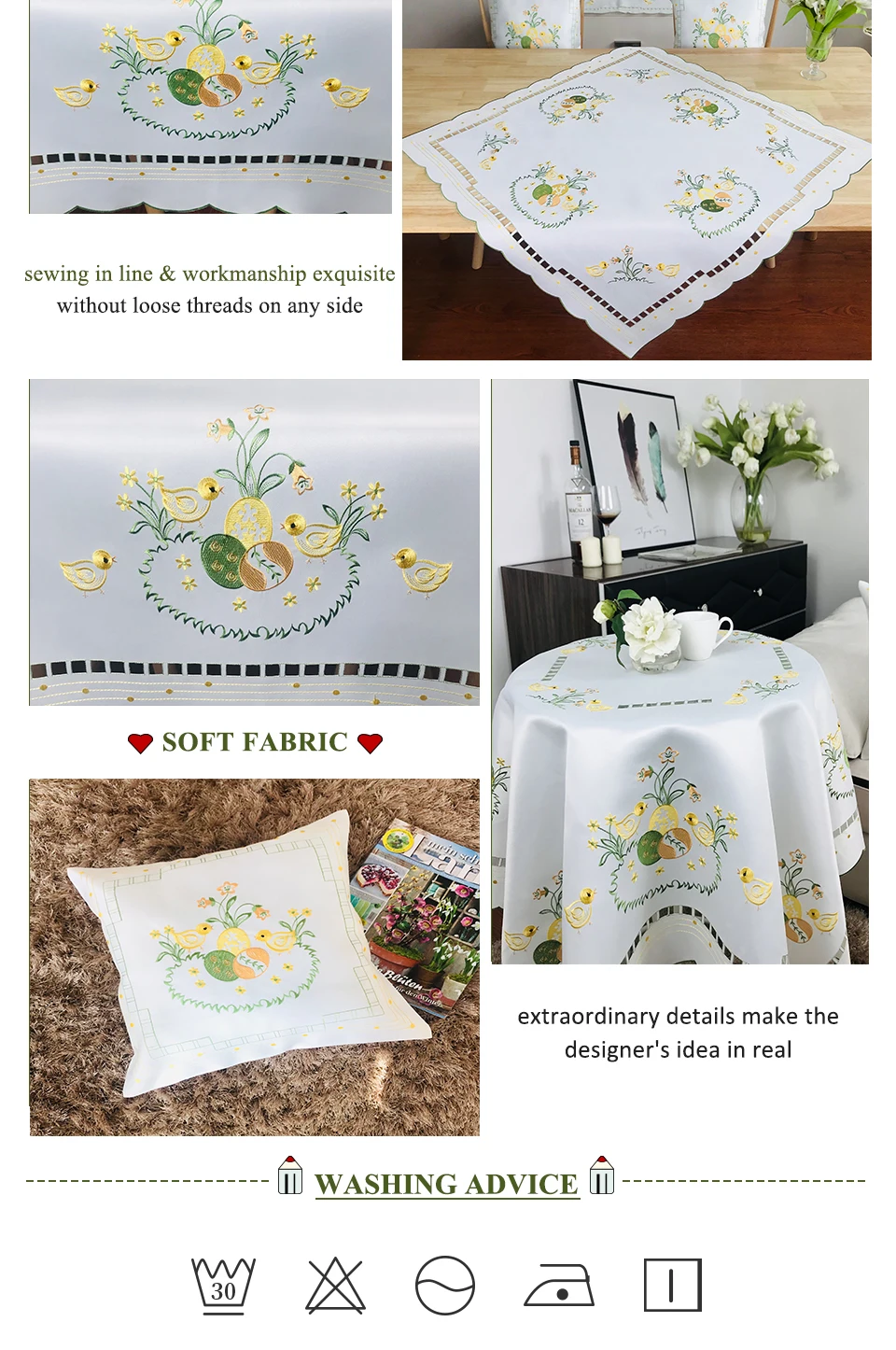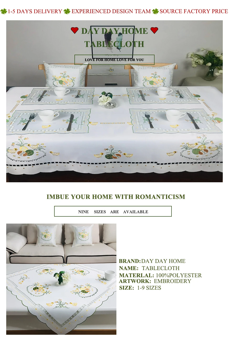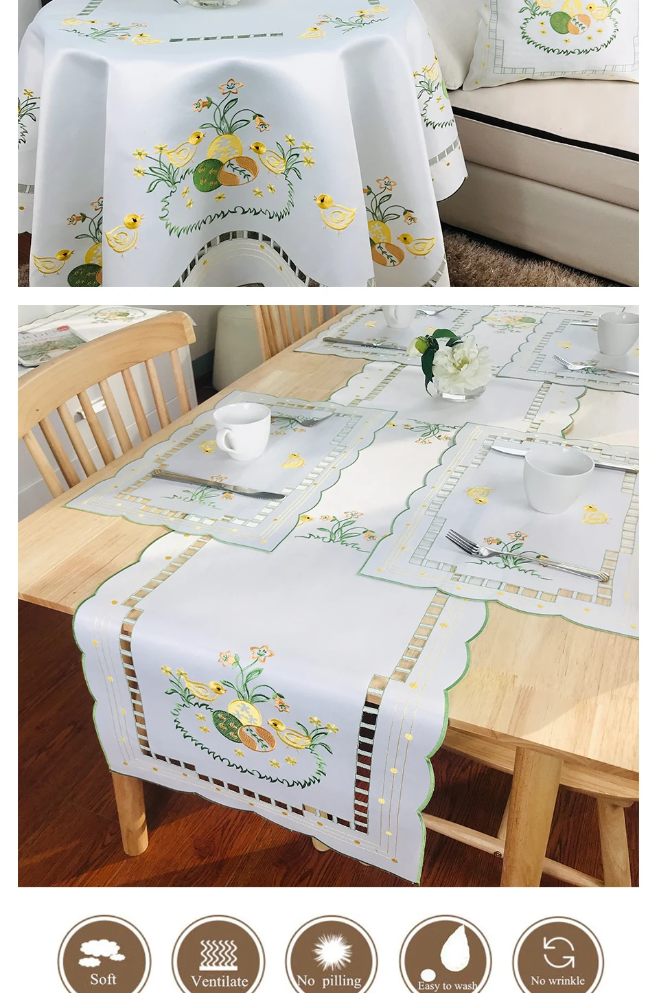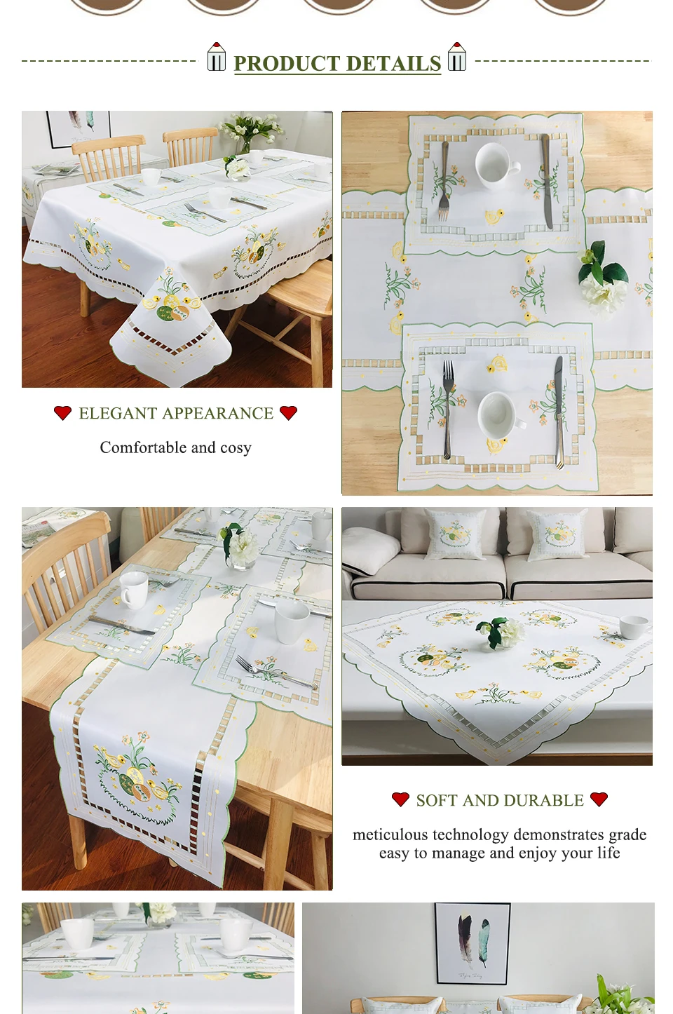 This embroidered tablecloth napkin is crafted from polyester with a silk-touch fiber for a modern home decor accent. Featuring a charming cartoon-style hollow-carved design, it adds a delicate and stylish touch to your living space without the use of harmful chemicals.