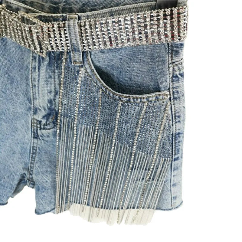 Europe America Style Shorts High Waist Wide Legs Denim Shorts Rhinestones Tassels