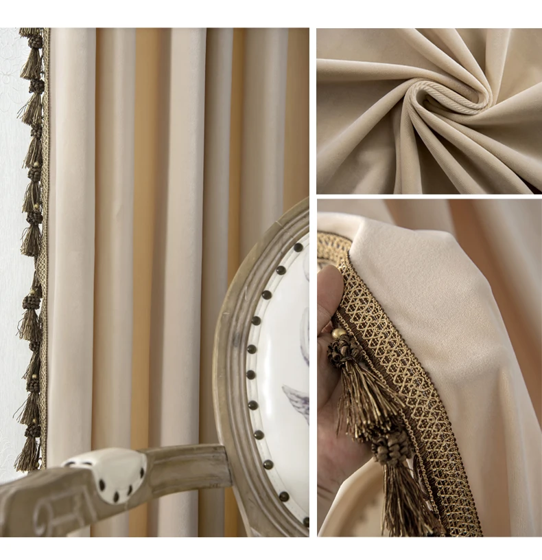 Experience luxury with these European velvet curtains in a soft pink milk tea hue, perfect for living rooms, bedrooms, and villas. Crafted from 100% polyester with intricate tatting, they provide 41% to 85% shading for privacy and light control. Designed for French windows, these curtains install easily on ceilings and open with a smooth left and right biparting style. Customizable to fit your space, they come with all necessary accessories included. Please note tassels, tiebacks, beads, and valances are sold separately. Ideal for adding a modern, elegant touch to any interior.