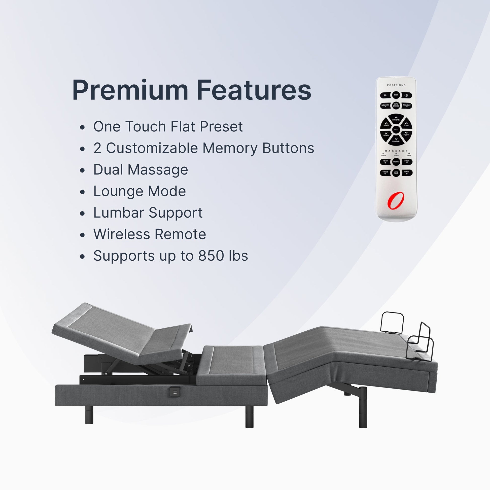 The Falcon II base has it all. Featuring lumbar support capabilities, 4 wave Dual Massage, true lounge capabilities, under-bed LED lighting, USB charging outlets, Zero Gravity preset, Anti-snore preset, 2 personal positions, and High Performance Motors.
