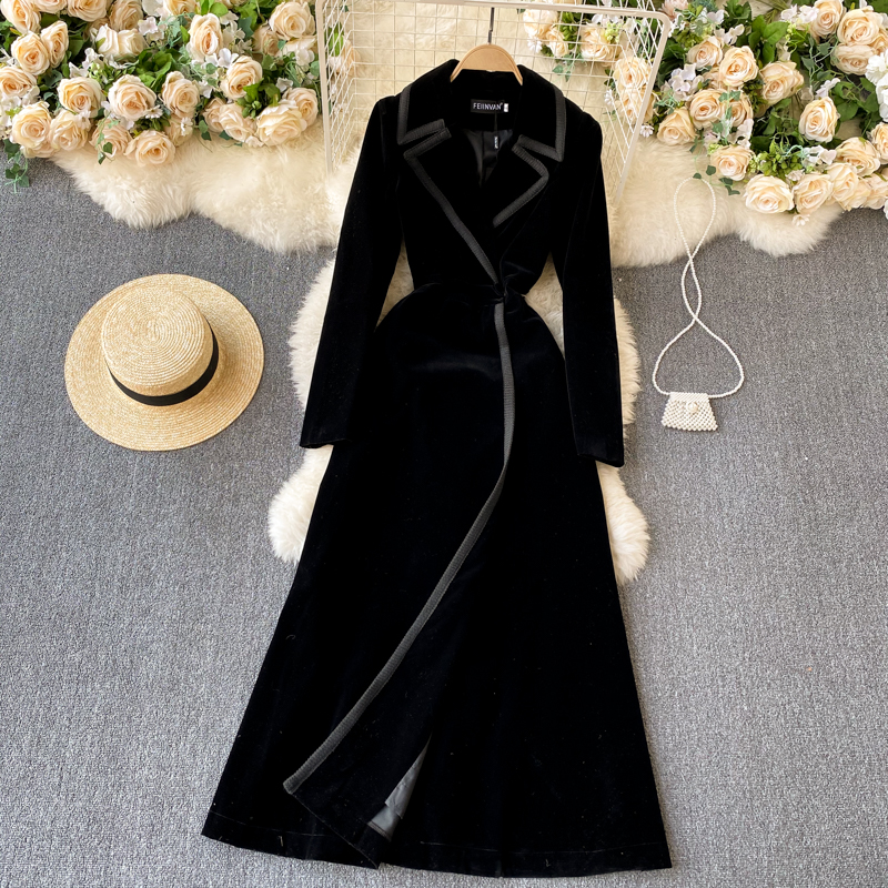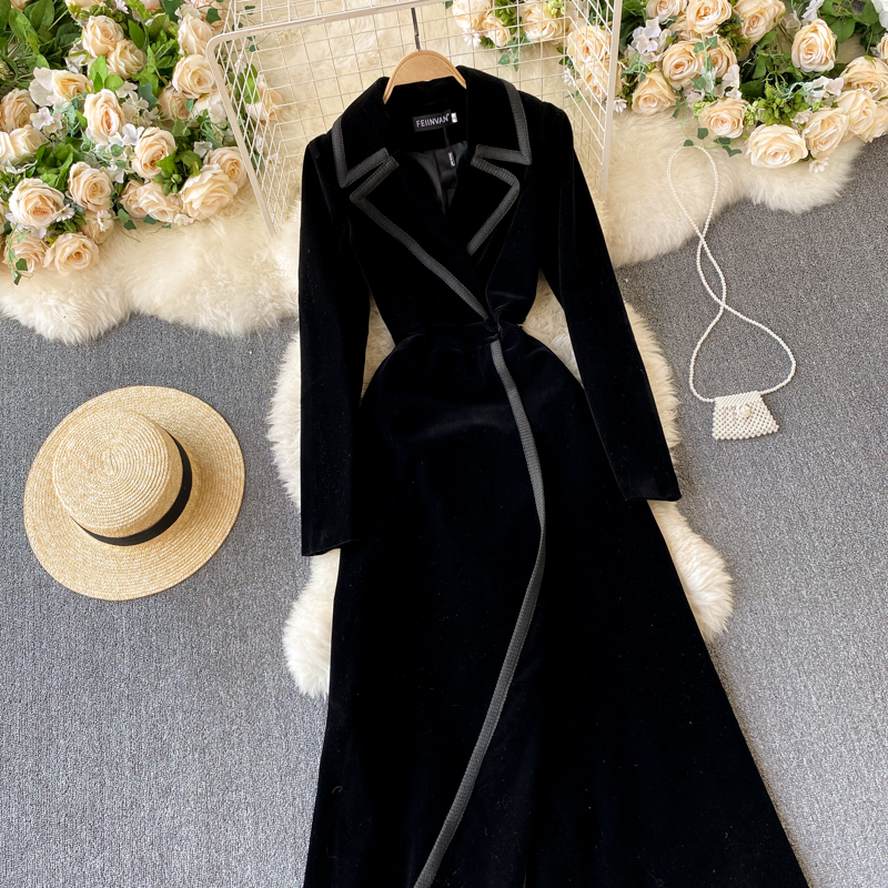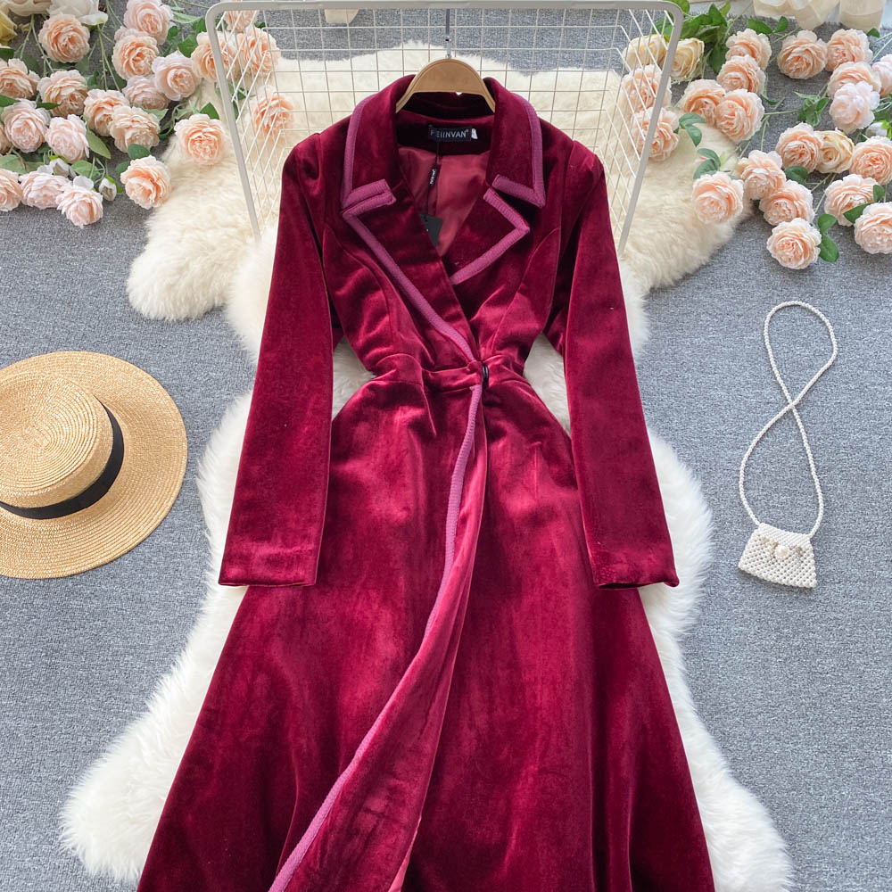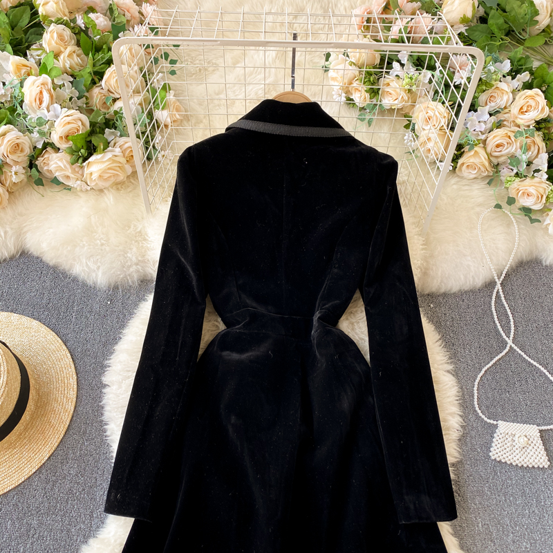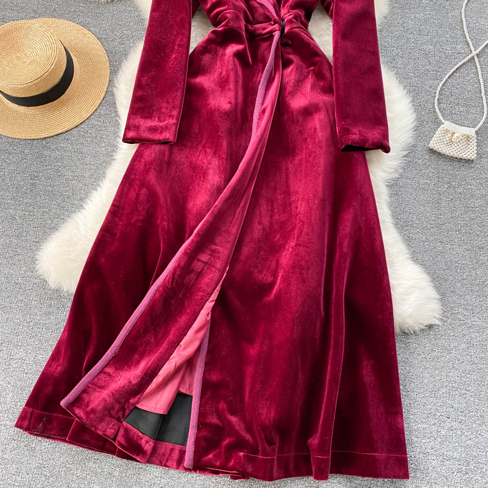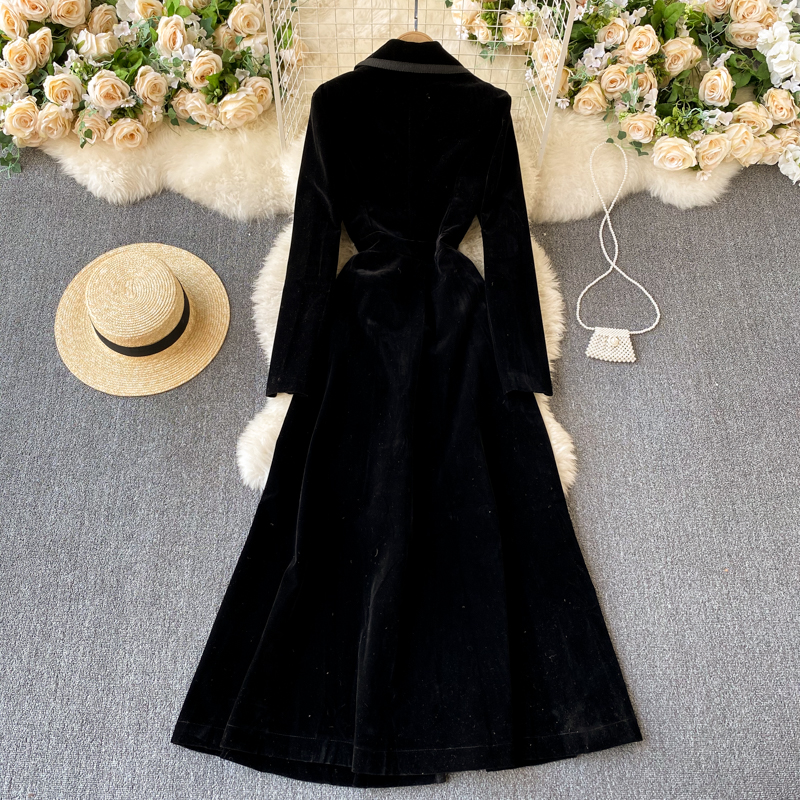 Experience refined sophistication with this fall midi dress, expertly crafted from luxurious velvet that drapes beautifully in an A-line silhouette. The elegant turn-down collar and full-length sleeves create a polished look perfect for cooler seasons, while the loose fit ensures all-day comfort and ease of movement. Featuring practical pockets and durable construction with anti-wrinkle and breathable properties, this versatile piece transitions effortlessly from casual outings to more refined occasions. The natural waistline flatters your figure, making this timeless dress an essential addition to your winter wardrobe that combines style with everyday wear.