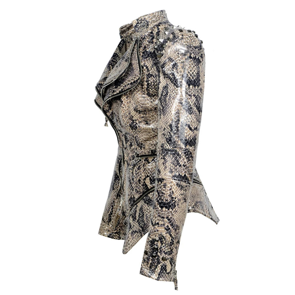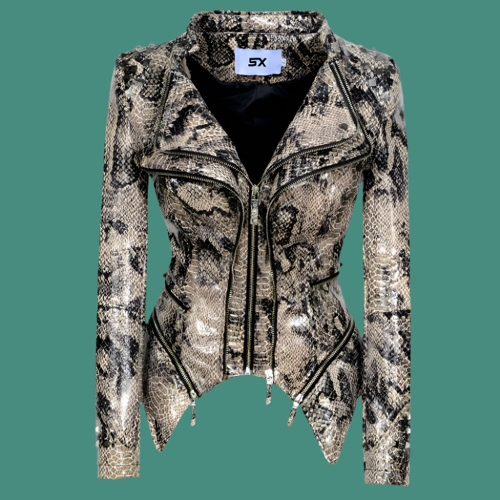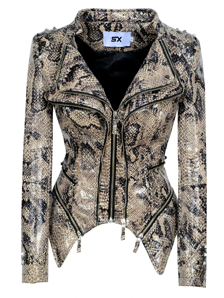 This women's motorcycle jacket combines smooth PU leather with a sleek snake pattern for a stylish, street-inspired look. Featuring a turn-down collar, full-length sleeves, and a zipper closure, it offers a slim fit that enhances your silhouette. Decorative rivets, zippers, and shoulder studs add edgy details, while the detachable lower edge provides versatility. Designed for all seasons, this casual yet punk-inspired jacket is perfect for juniors seeking a trendy and confident style.