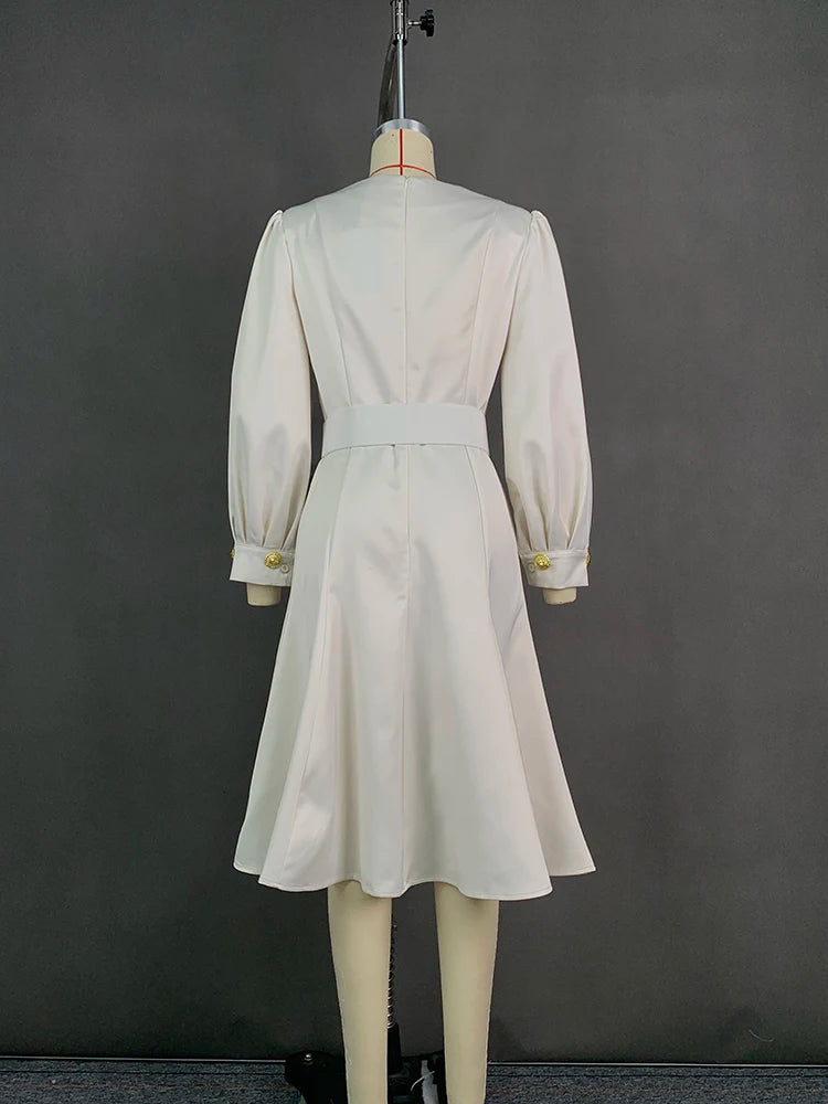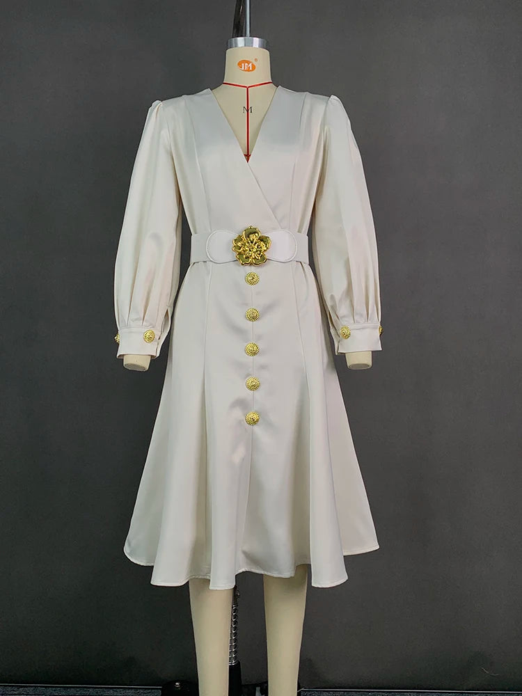 Formal Midi Elegant Evening Dresses Autumn Puff Sleeves Tied Waist V-Neck