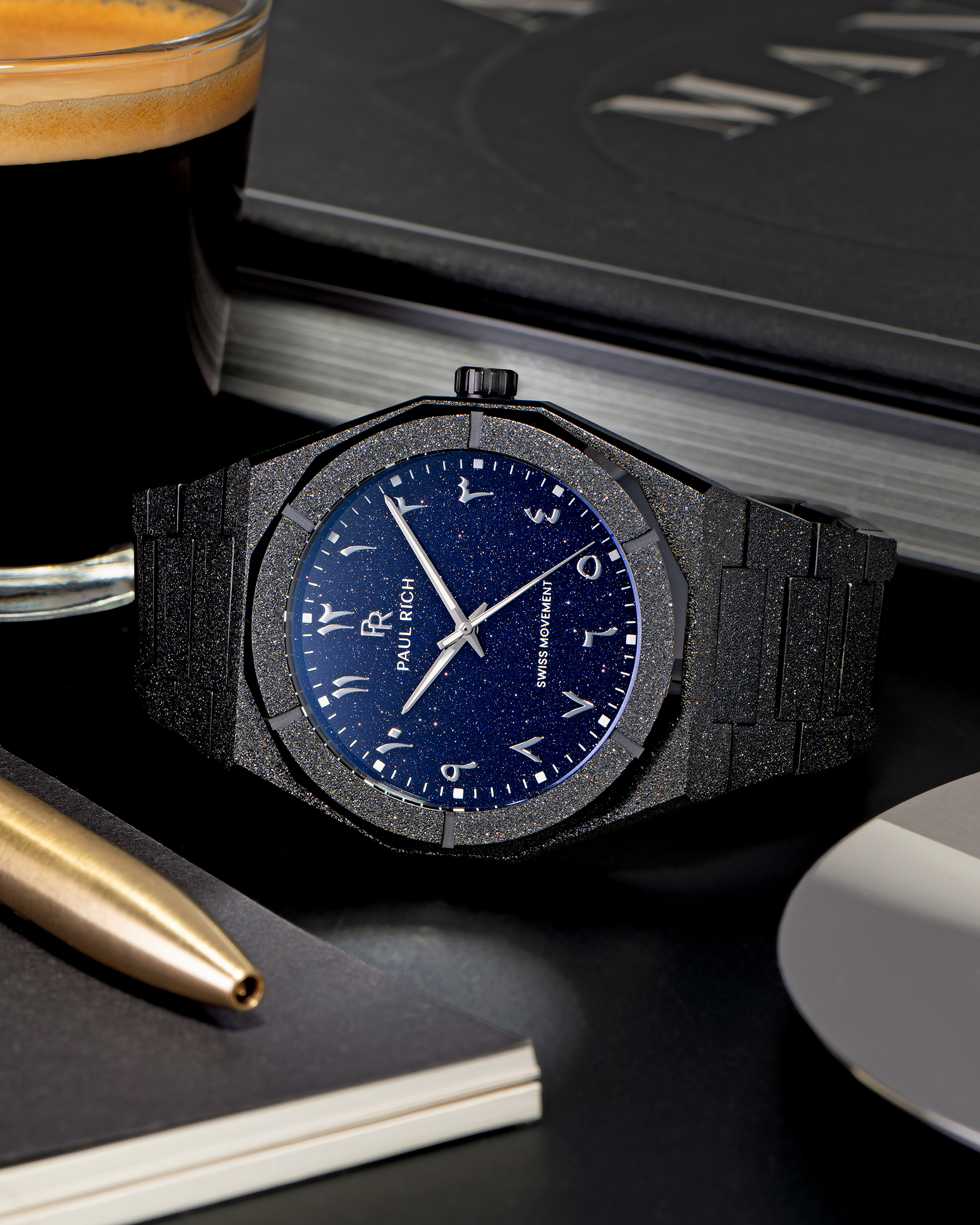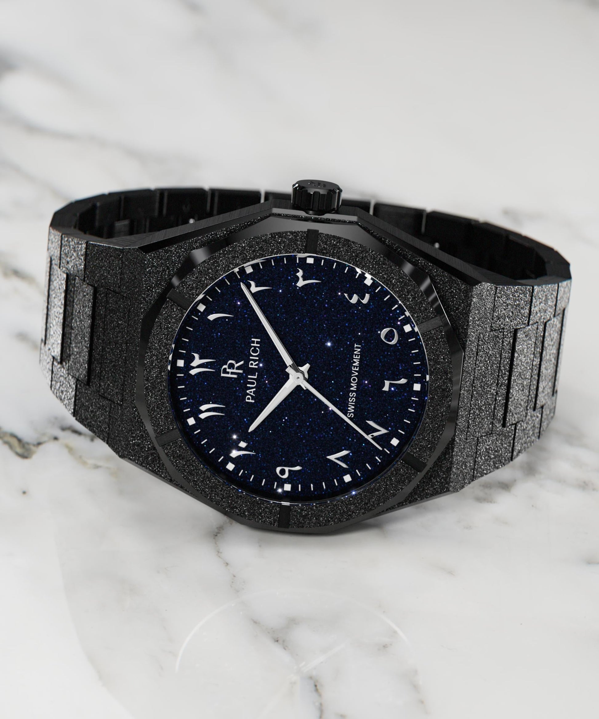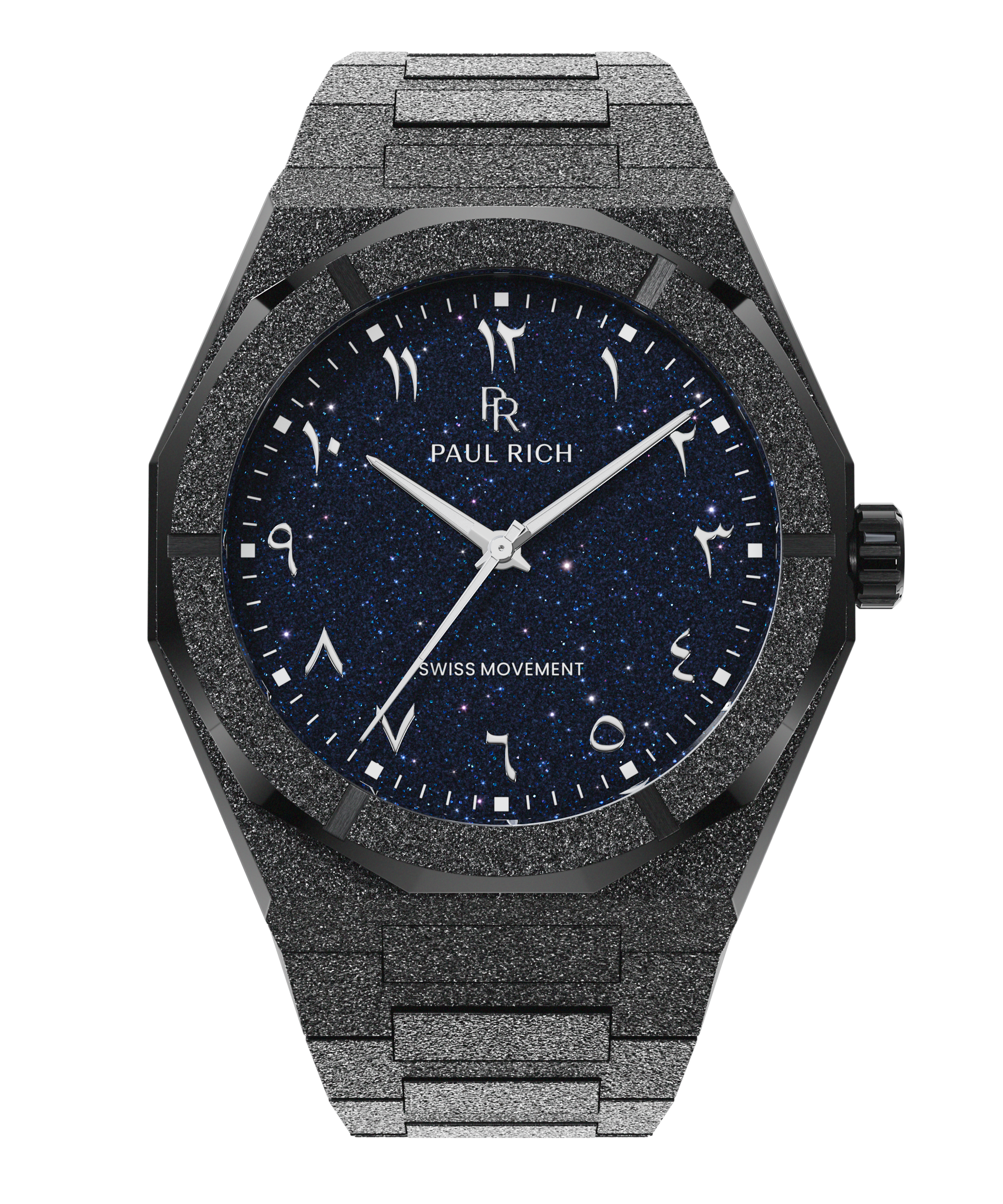 A fusion of cosmic elegance and Arabic heritage. This watch isn’t just about time—it’s about legacy. Arabic numerals on a galaxy dial, a nod to the Arabic world’s impact on math and astronomy. Wrapped in stainless steel with a frosted finish that hits like diamond dust. This isn’t just a watch; it’s culture on your wrist. Bold. Proud. Unmatched.