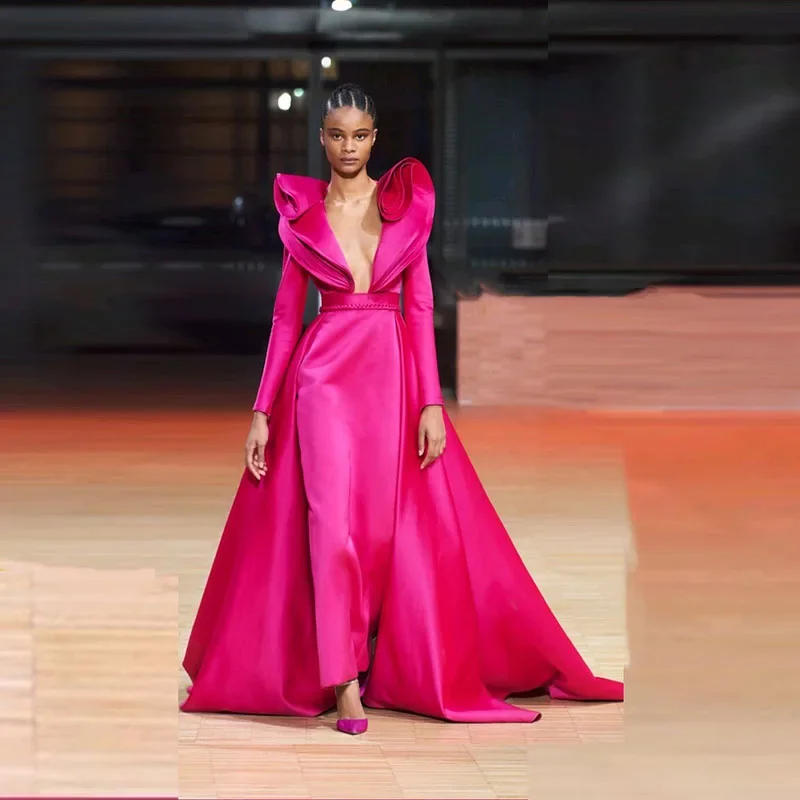 Fuchsia Deep V Neck Ruffles A Line Evening Gown Long Sleeves Satin Sweep Train