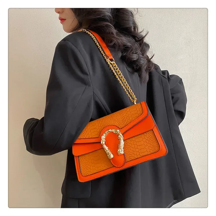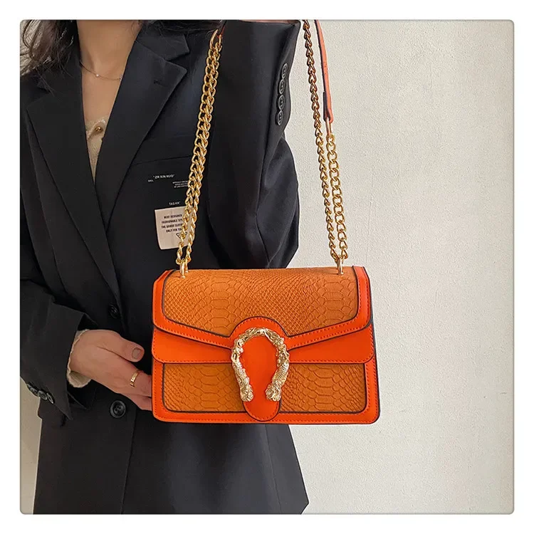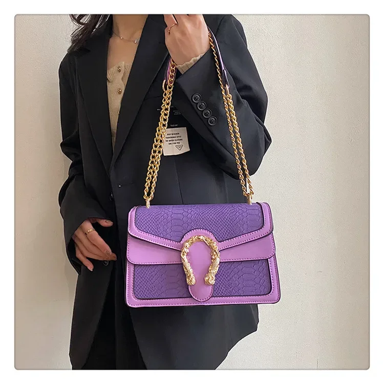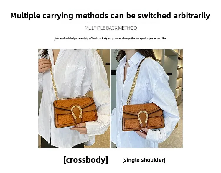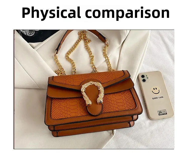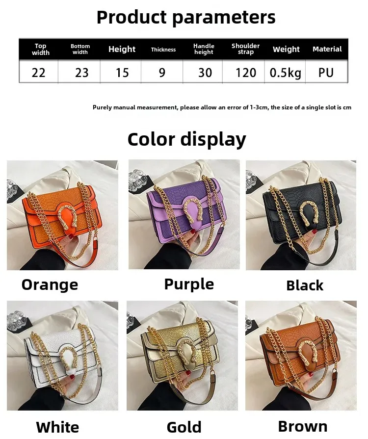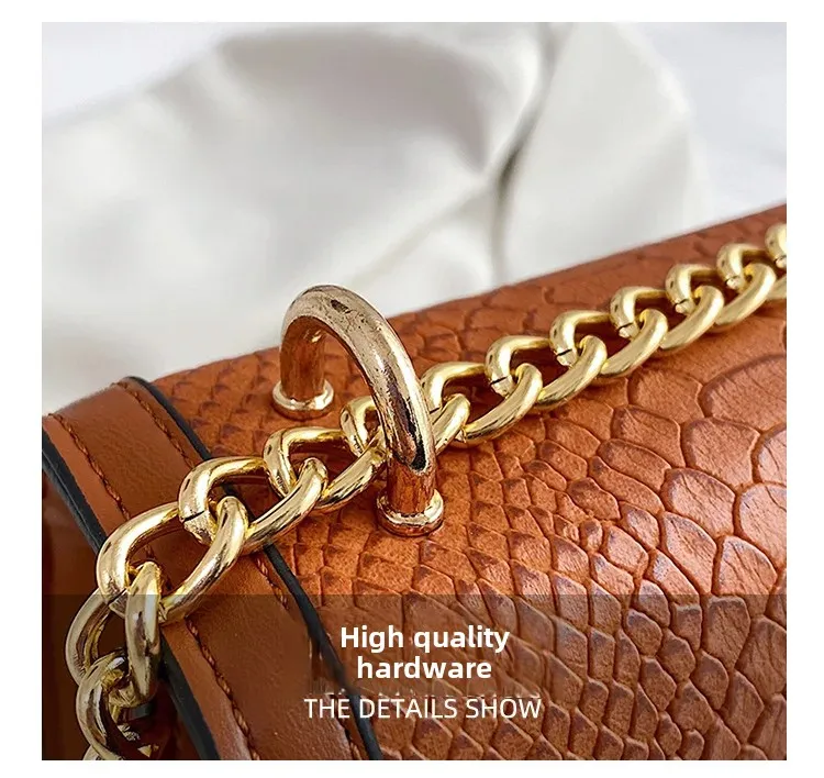 This fashionable women's crossbody bag showcases a chic gold chain and a distinctive crocodile pattern. Crafted from quality materials, it presents a unique shape that enhances any outfit. Combining stylish elements with practical use, this bag is an elegant accessory for everyday wear.