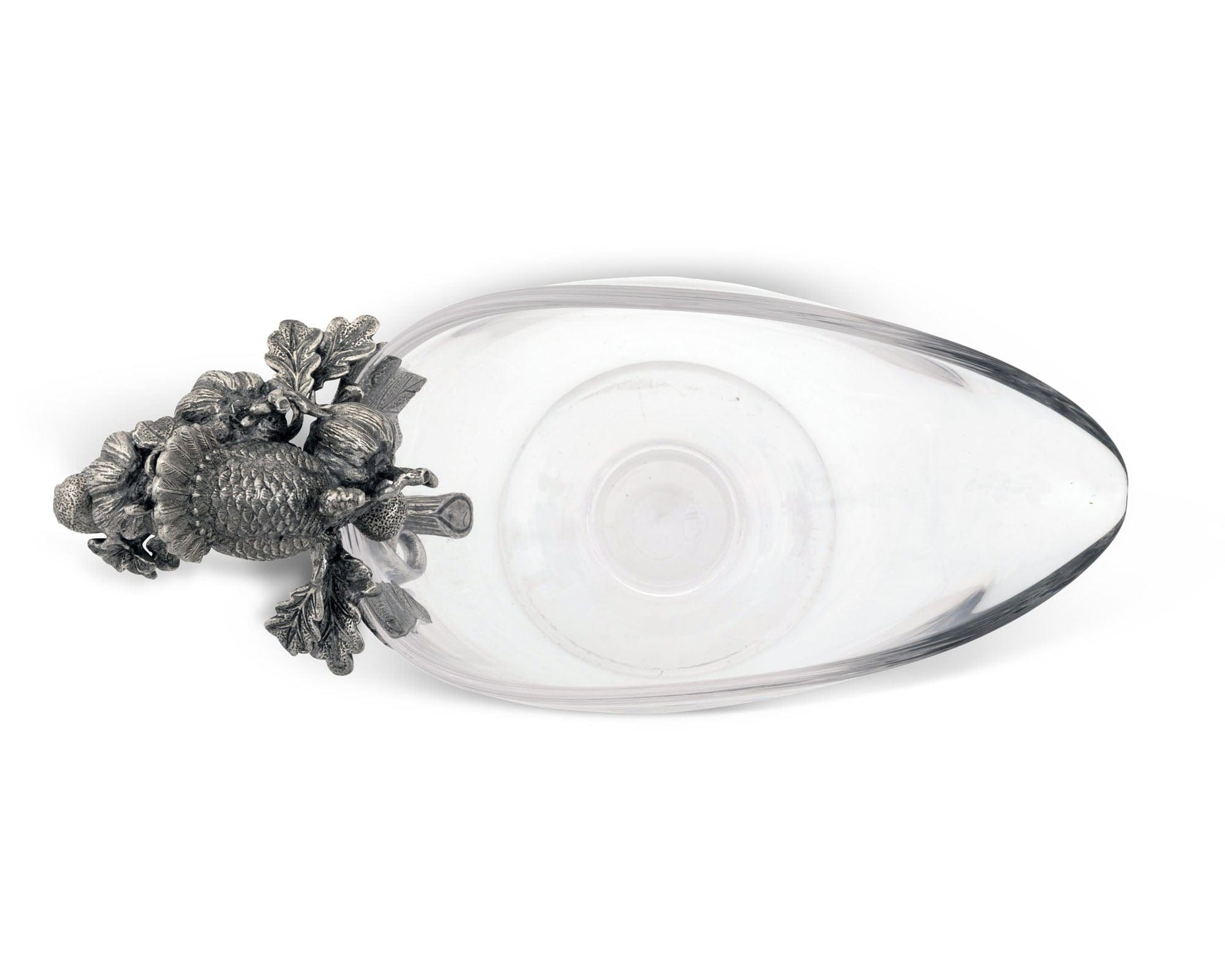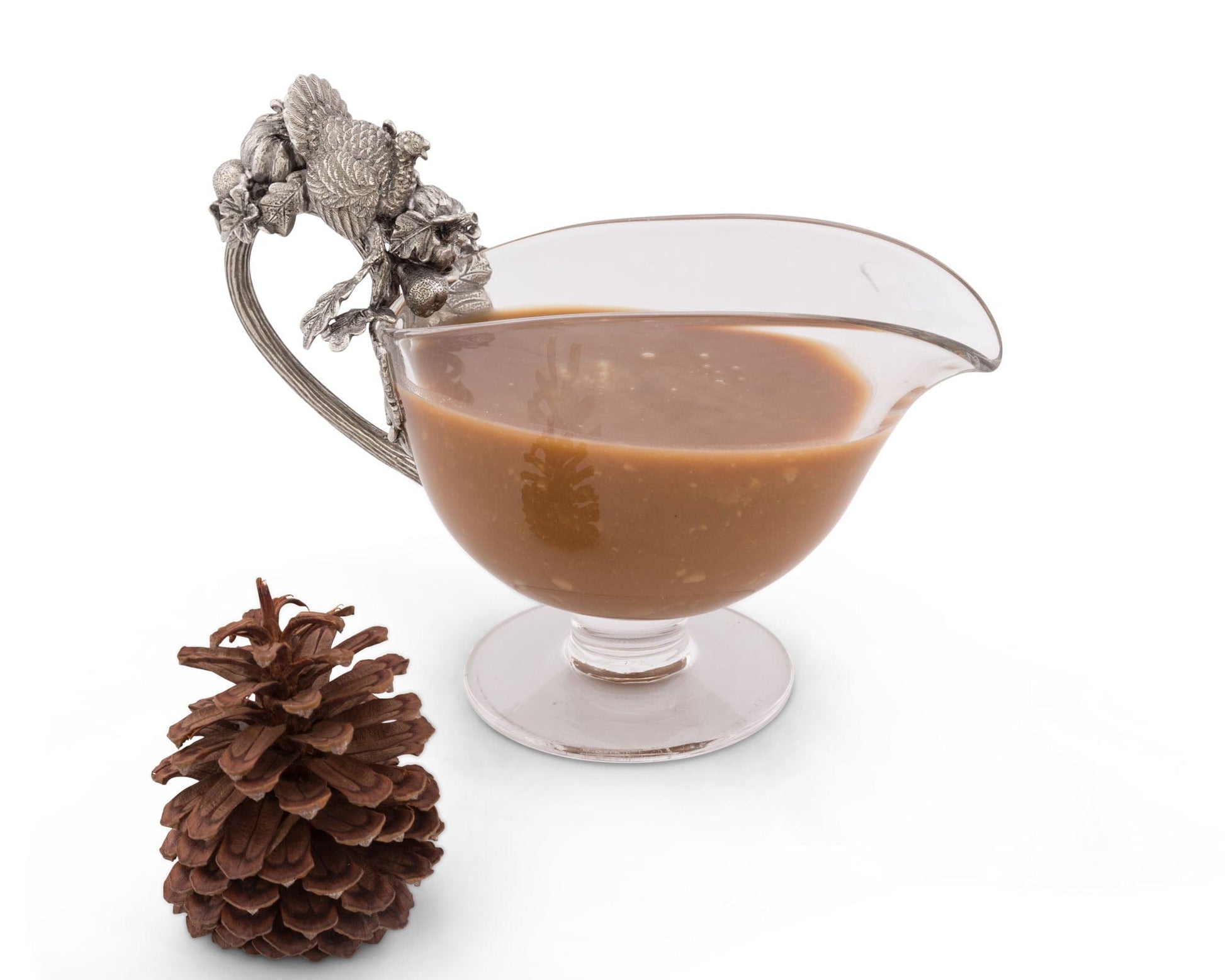 Enthrall your dinner guests with our Vagabond House Harvest Turkey glass gravy boat, a unique luxury gift for autumn festivities. Celebrating the rich abundance of the season, this hand-blown glass gravy boat is adorned with intricately detailed, handcrafted pewter decorations consisting of pumpkins, fall leaves and a noble turkey. The amply sized, curved bowl holds a generous amount of gravy, perfect for Thanksgiving feasts, while the transparent pitcher showcases your homemade gravies and sauces. Its sturdy pedestal base protects your table, and the non-drip spout lip ensures effortless pouring.