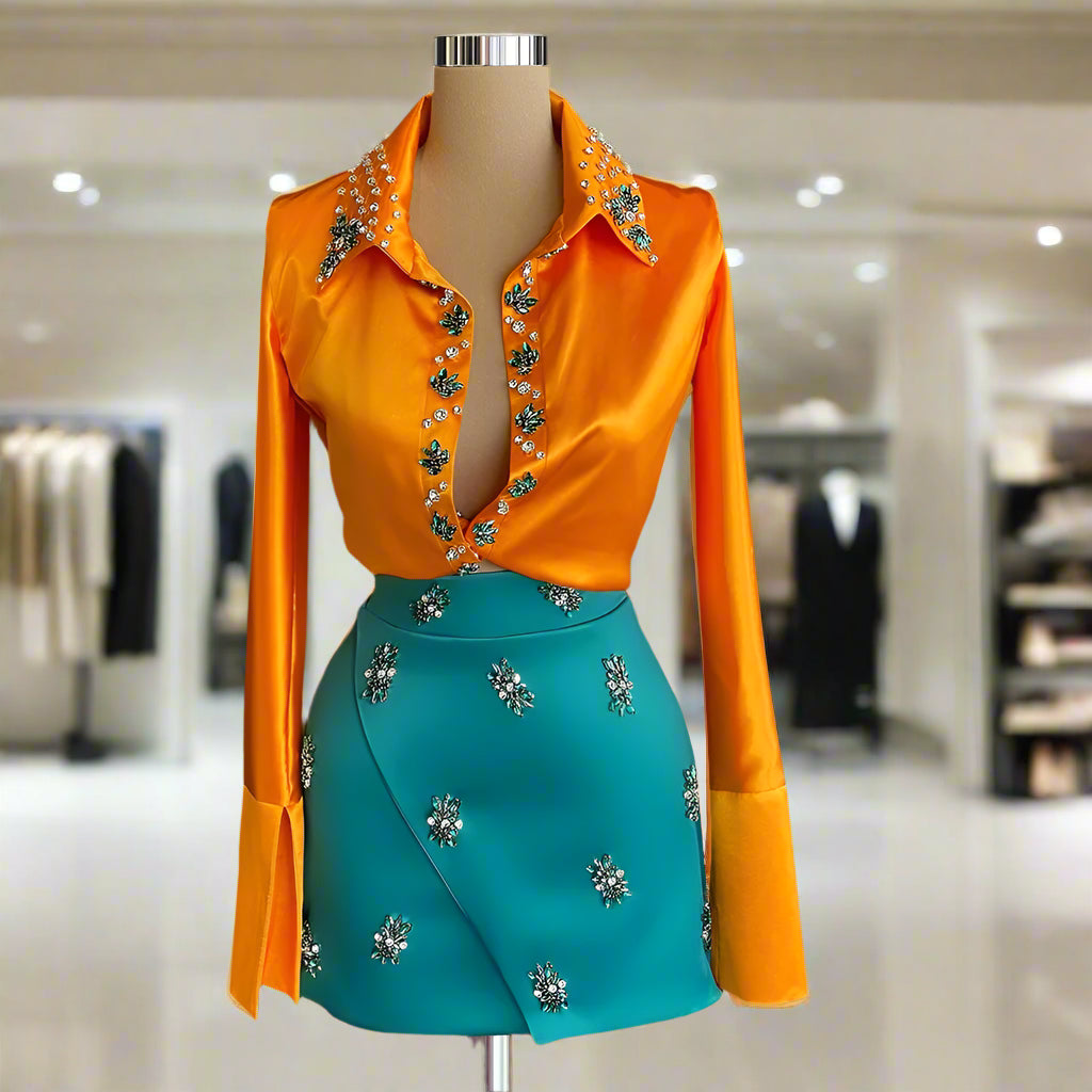 Haute Couture Two Piece Cocktail Set Long Sleeves Fashion Rhinestones