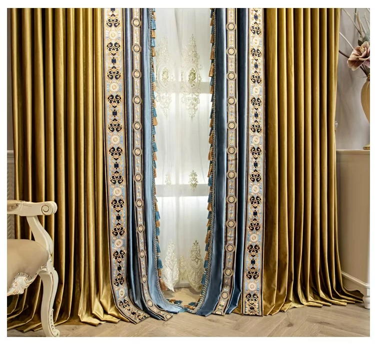 High-end European-style luxury American-style golden and blue shading velvet curtains bedroom living room villa customization