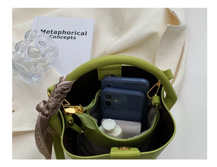 This premium mini bucket bag showcases a soft, textured PU leather exterior, ideal for versatile everyday use. It features a secure hasp closure and stylish scarf accents, designed specifically for women. The bag’s smooth polyester lining and solid color pattern blend practicality with fashion. Lightweight and comfortable, it suits a variety of occasions. We invite you to explore our store and find the perfect bag that fits your style.