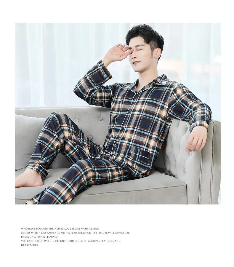 High Quality Autumn Pajamas Mens Milk Silk Sleepwear Long Sleeve 2 Pieces Pajama Set Men Casual Style