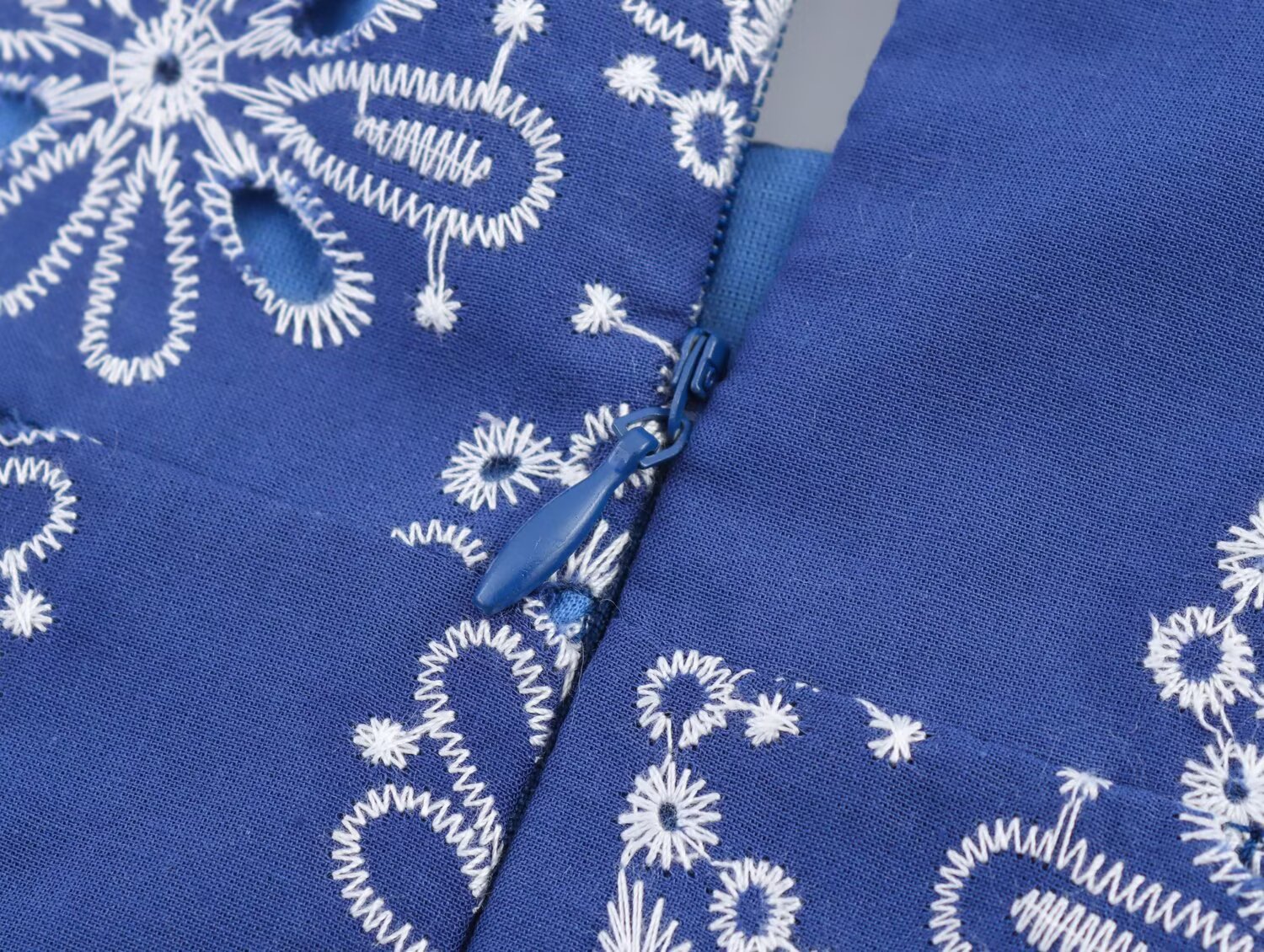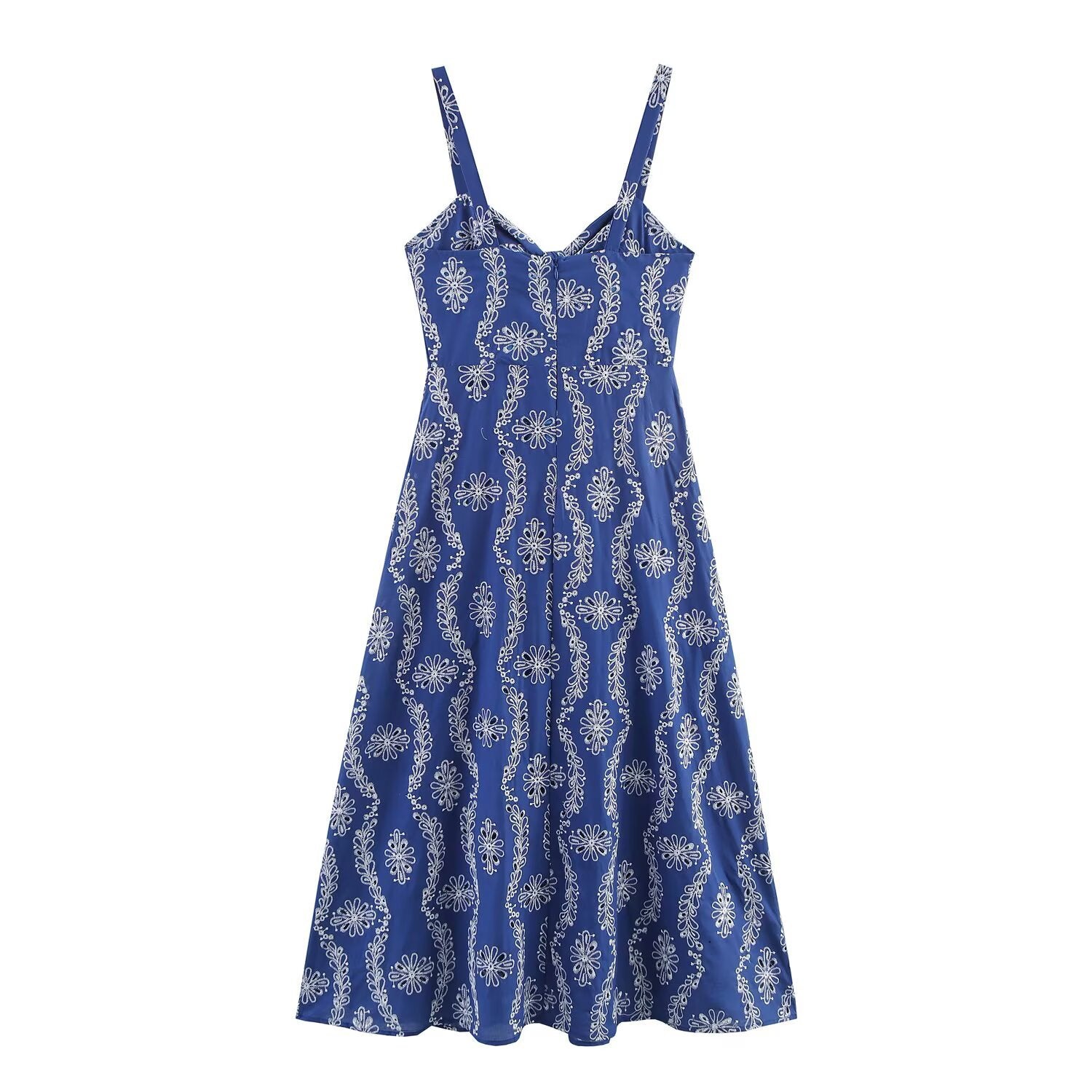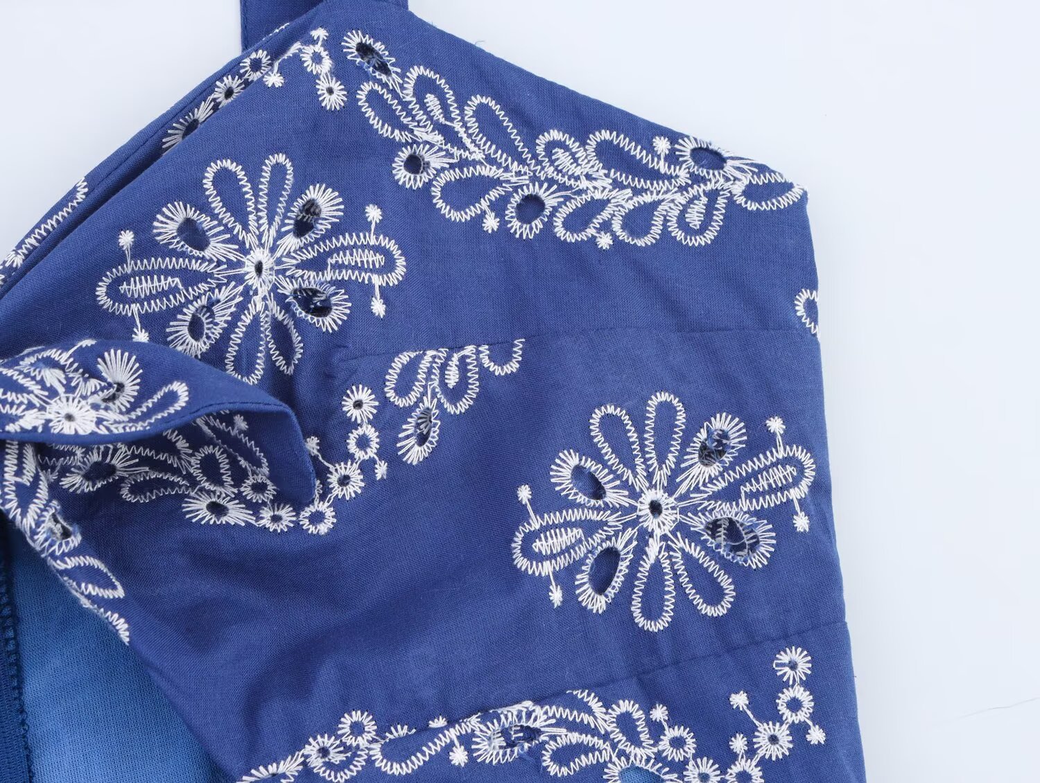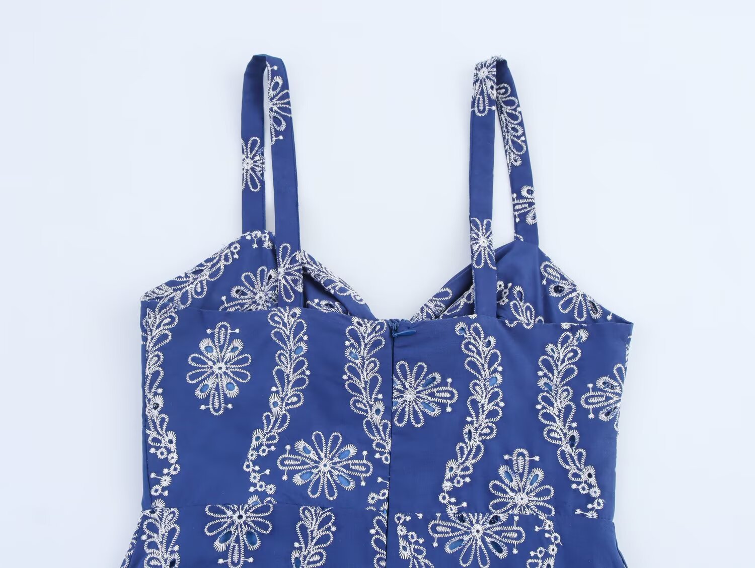 This elegant sleeveless suspender dress in royal blue combines European and American styles for a chic look. Featuring a V-neck and long skirt, it showcases delicate embroidered hollow lace details and a convenient zipper closure. Made from polyester, this camisole-style dress offers a comfortable fit perfect for casual occasions. Available in XS, S, M, and L sizes.