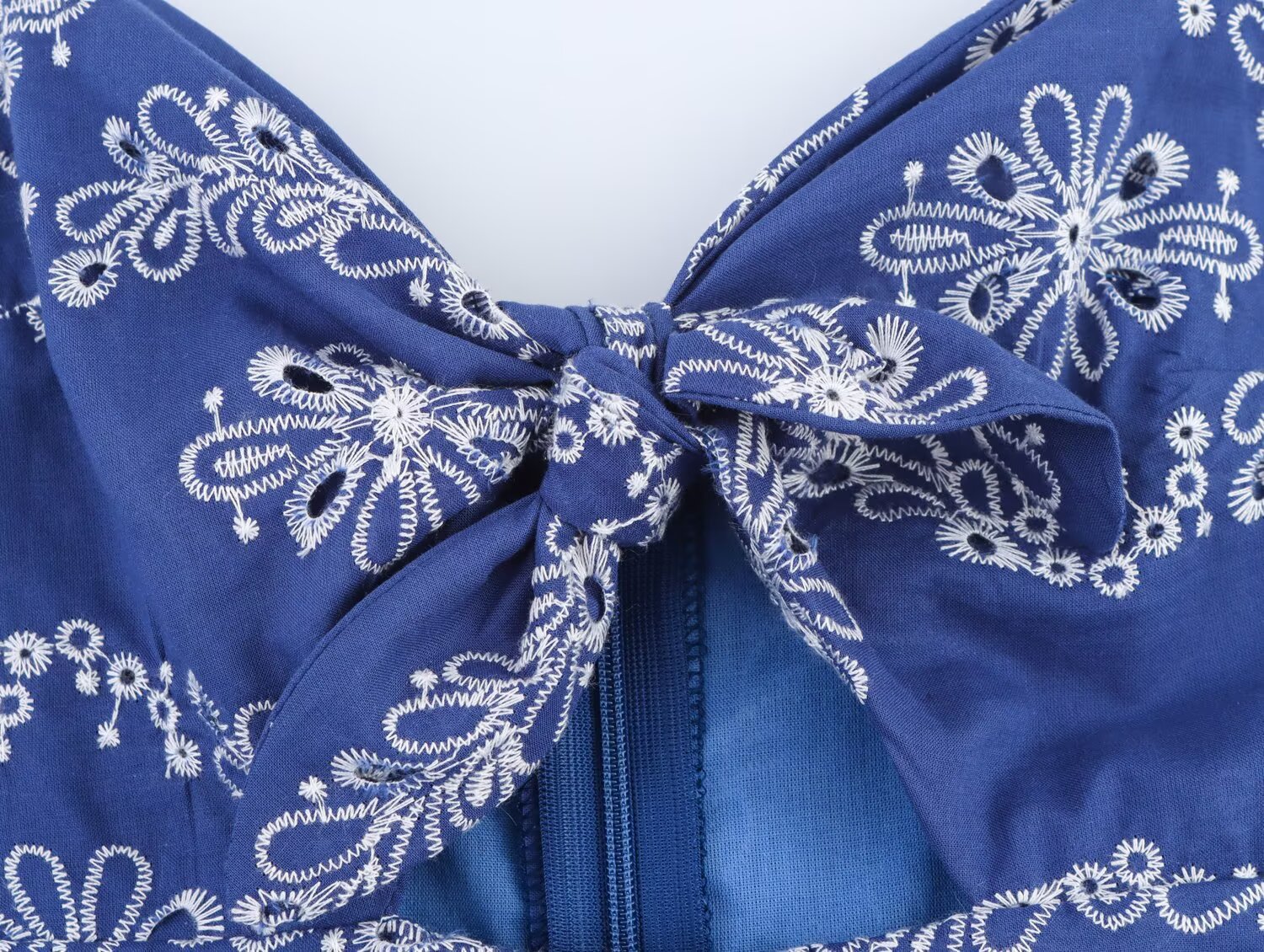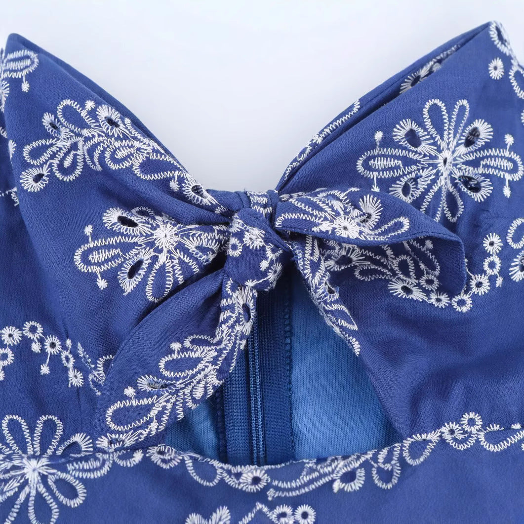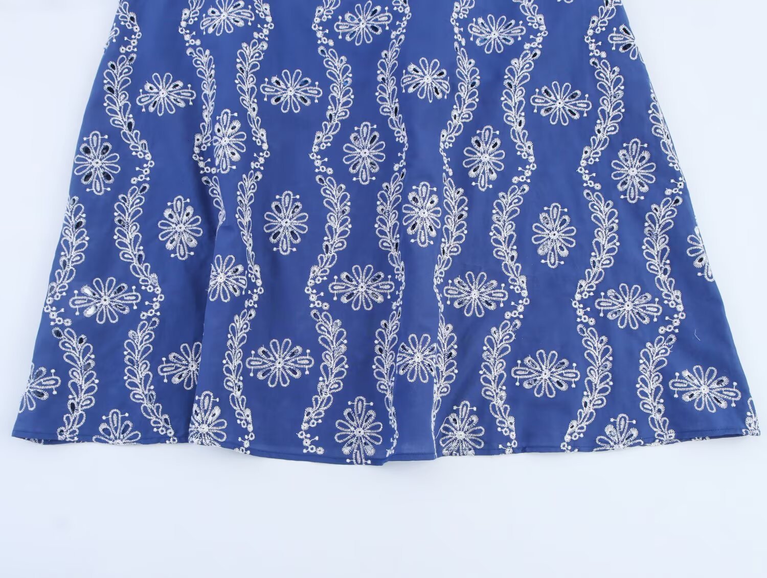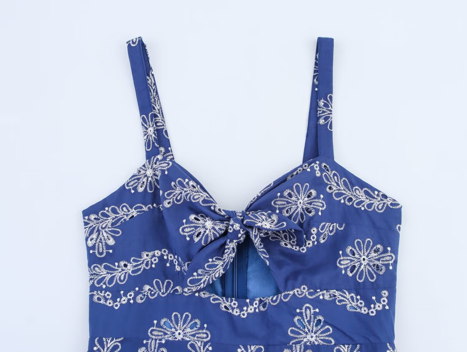 This elegant sleeveless suspender dress in royal blue combines European and American styles for a chic look. Featuring a V-neck and long skirt, it showcases delicate embroidered hollow lace details and a convenient zipper closure. Made from polyester, this camisole-style dress offers a comfortable fit perfect for casual occasions. Available in XS, S, M, and L sizes.