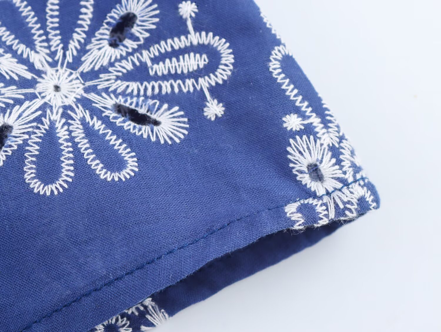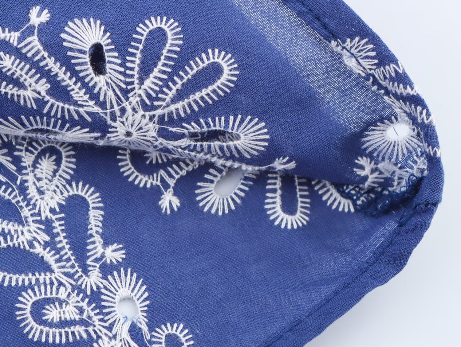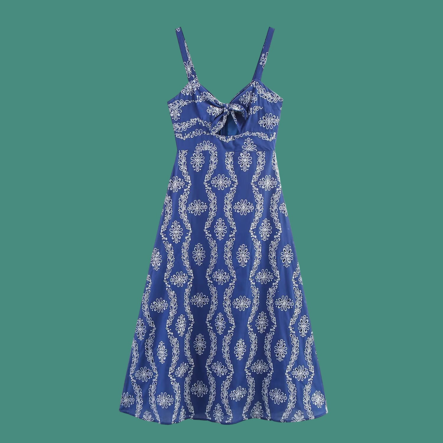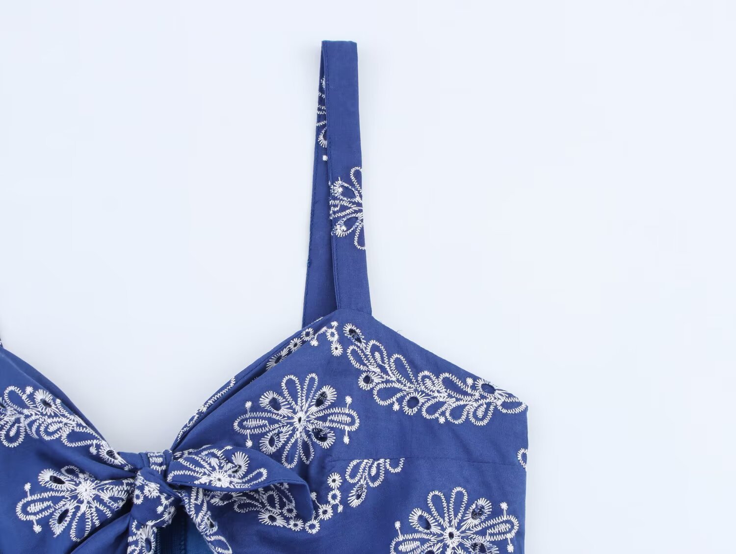 This elegant sleeveless suspender dress in royal blue combines European and American styles for a chic look. Featuring a V-neck and long skirt, it showcases delicate embroidered hollow lace details and a convenient zipper closure. Made from polyester, this camisole-style dress offers a comfortable fit perfect for casual occasions. Available in XS, S, M, and L sizes.