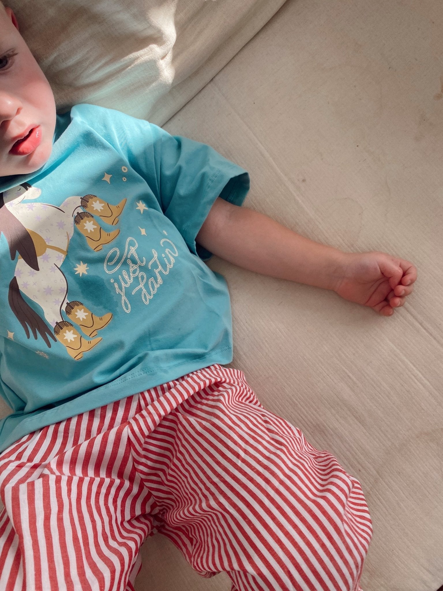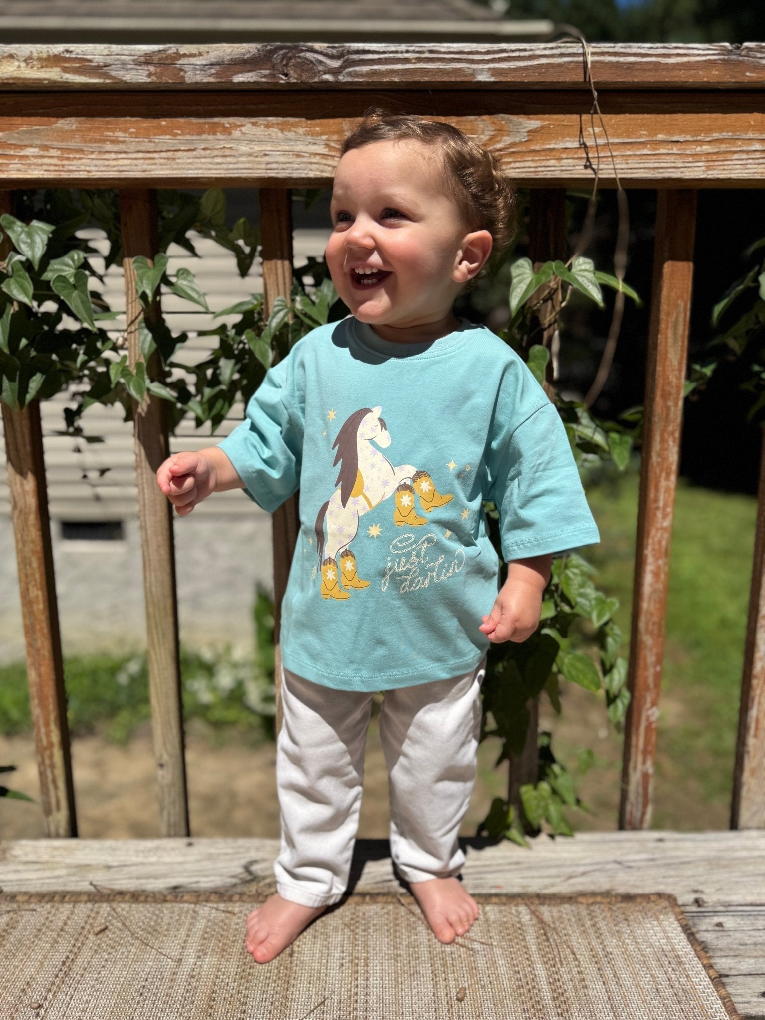 this unisex toddler t-shirt in soft blue features our just darlin’ graphic, a horse sporting cowboy boots, printed big and bold on the front. playful yet timeless, it’s made for little ones who can pull off a touch of cowboy flair anywhere they go, from backyard hangs to family outings.